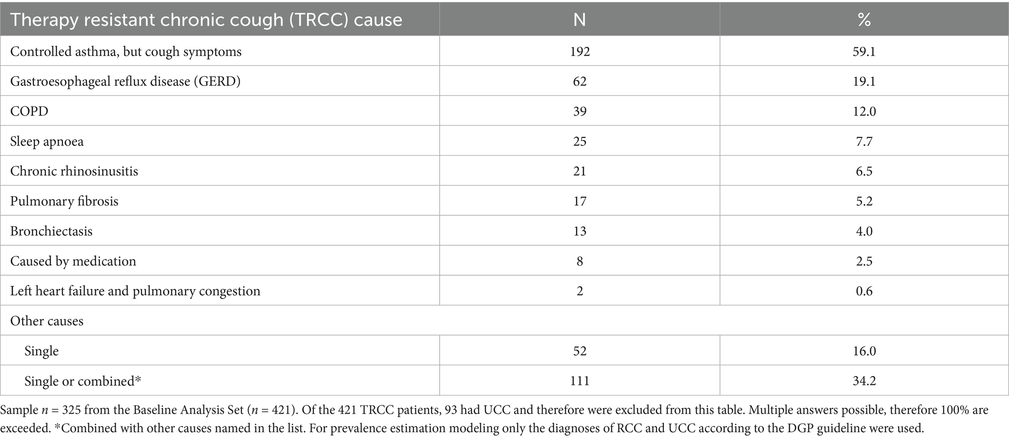 High rates of underlying medical conditions are a typical finding in cough studies (12). For example, in the recently published German arm of KANTAR study, individuals with CC in general (not limited to RCC/UCC) had additional diagnoses of the respiratory system in 71% of the cases, the digestive tract in 34%, and cardiovascular diseases in 28%. Consequently, they had higher morbidity scores compared to patients without CC (11).
