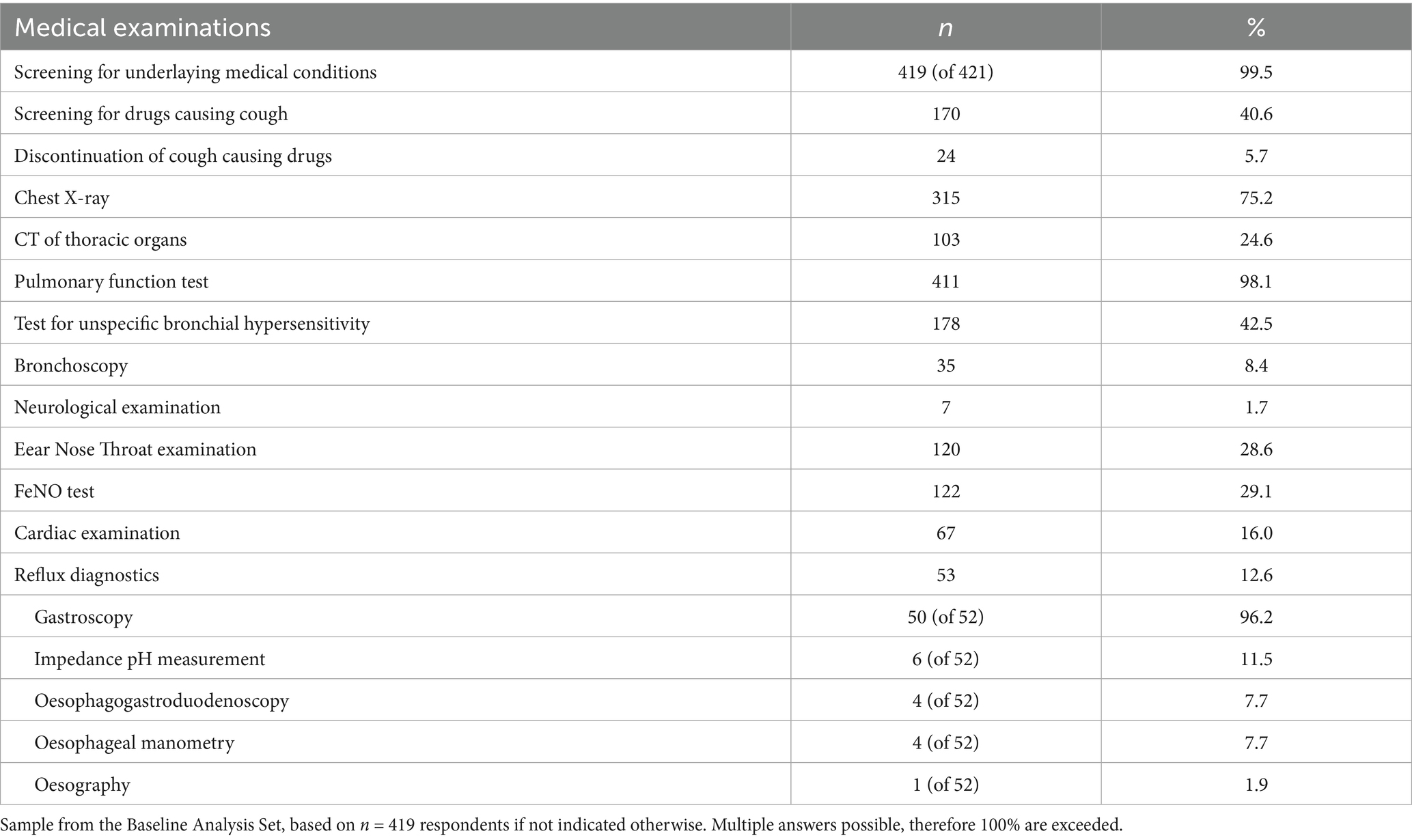 A wide variety of medical examinations were performed to confirm the diagnosis and exclude other conditions. Screening for cough-causing drugs was done in 40.6% of the patients including discontinuation of the identified drugs. Diagnostic procedures included chest X-rays in 75.2% of the patients, CT scan of thoracic organs in 24.6%, pulmonary function tests in 98.1%, test for unspecific bronchial hyperreactivity in 42.5%, measurement of fractional nitric oxide concentration in exhaled breath (FeNO) in 29.1% (not reimbursed in Germany), and ear nose throat (ENT) examination in 28.6% of the patients (details in Table 2).