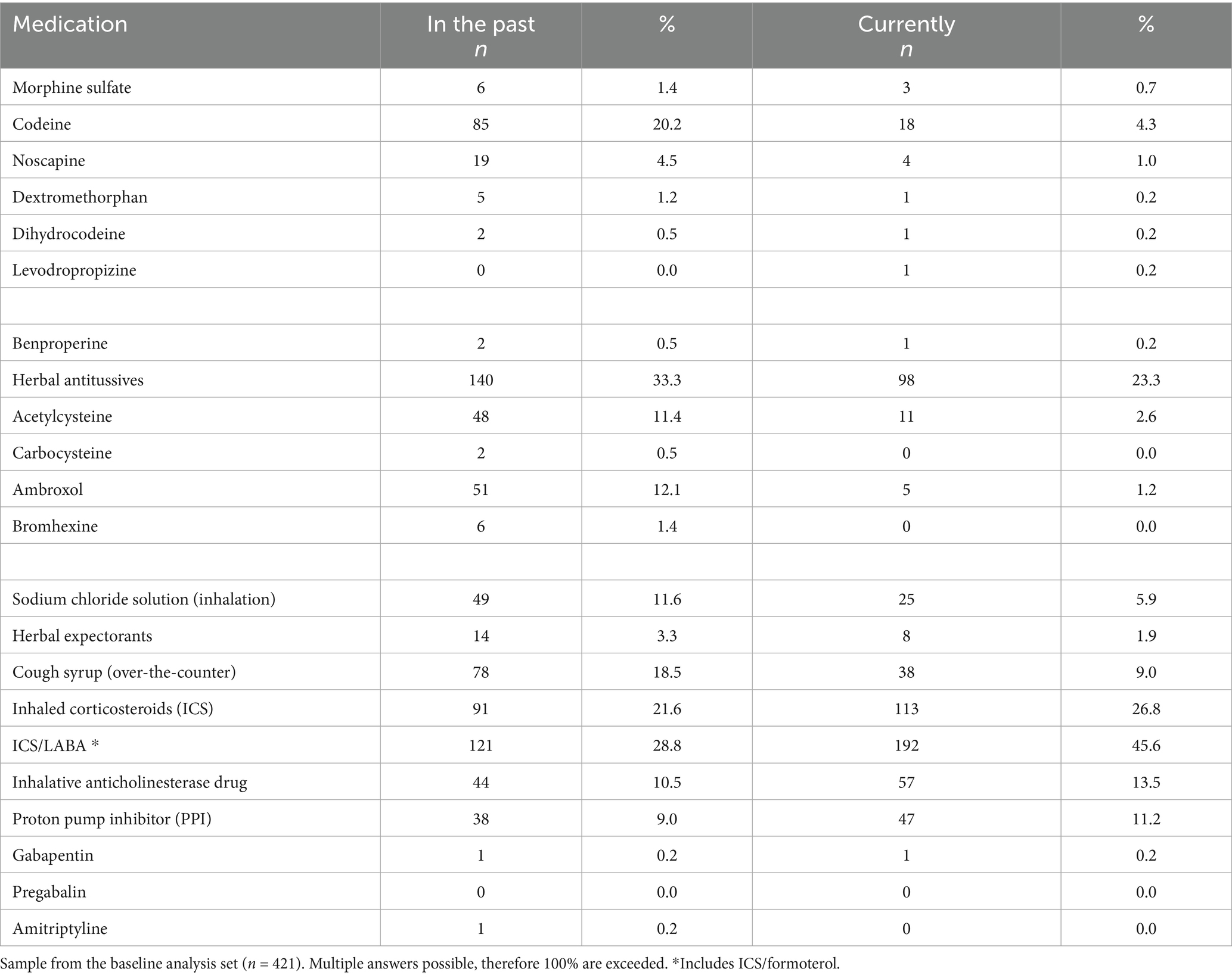 In Germany, codeine and noscapine are approved for short-term treatment of acute cough. However, at the time of the study, no medication was approved for the long-term treatment of CC, particularly RCC and UCC. In our study of RCC/UCC managed by pulmonologists, a broad variety of drugs were used, including off-label medications. Inhaled corticosteroids were among the most frequently used therapies, likely reflecting the assumption that the cough was due to cough variant asthma or eosinophilic bronchitis – conditions for which this treatment is recommended in both DGP and ERS guidelines as a trial for up to 4 weeks. Herbal antitussives were also used frequently. Notably, codeine, which was among the most frequently used drugs prior to the documented visit, played a minor role among the current medications.