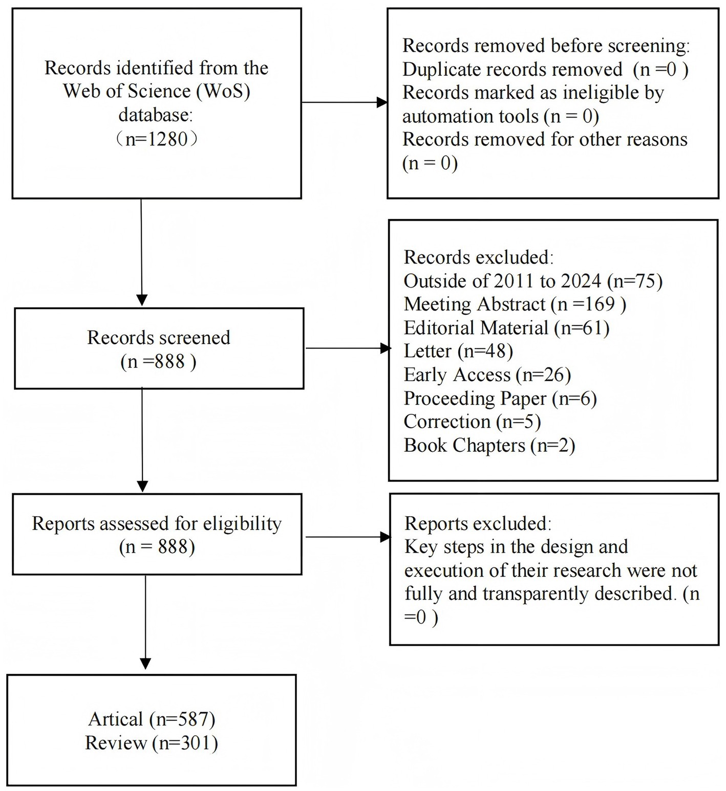 Flowchart detailing a record selection process from the Web of Science database. Initially, 1,280 records were identified. After removing duplicates, 888 records were screened. Records excluded due to criteria like date range, abstracts, or material type totaled 293. No records were excluded at the eligibility stage for lack of transparency. Ultimately, 587 articles and 301 reviews were determined eligible.