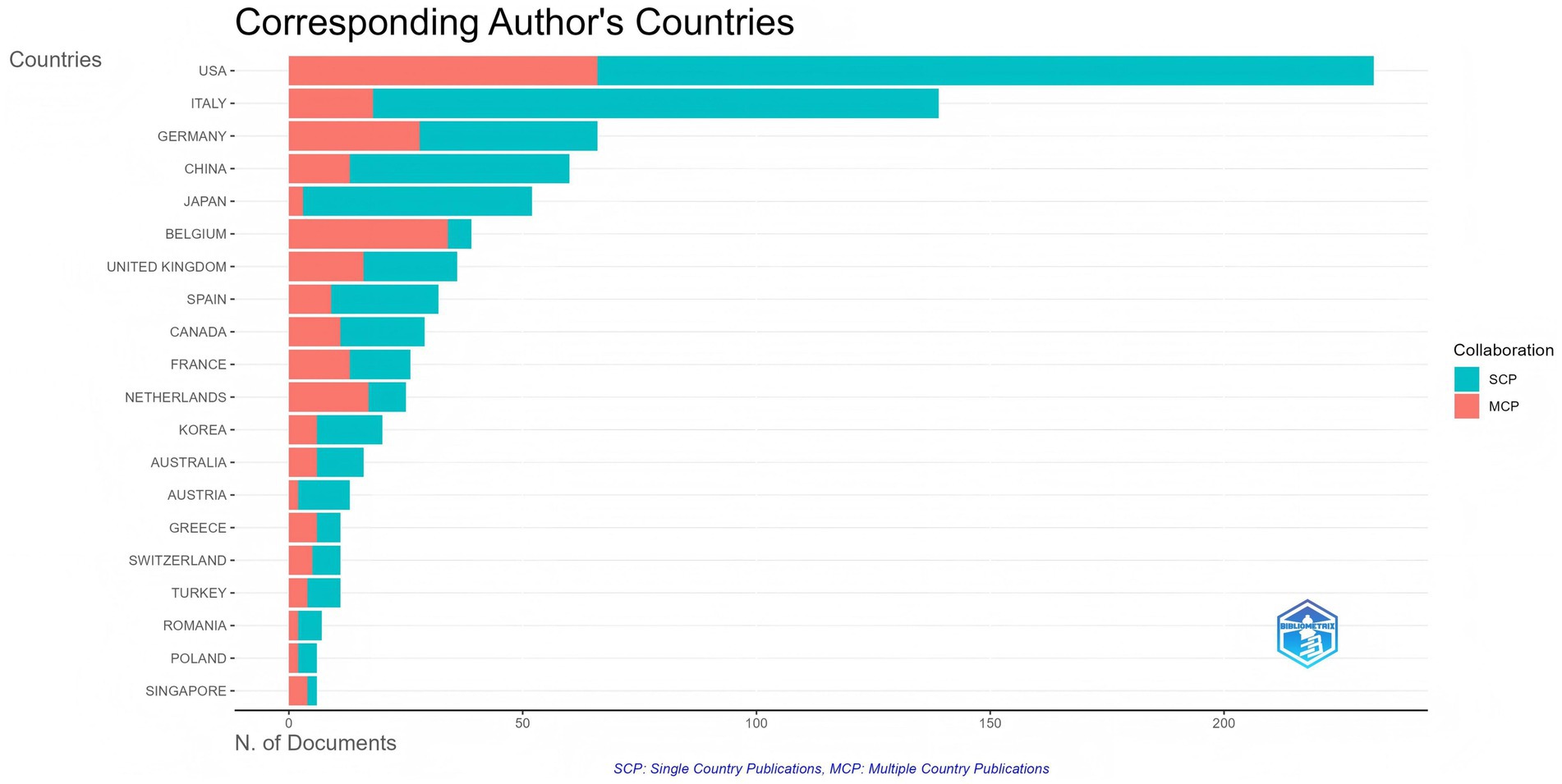 A total of 58 countries and 1,623 institutions have contributed to research on biologic treatments for CRS, with the top 10 most productive countries listed in Table 1. The United States led the field with the highest number of publications (n = 232), followed by Italy (n = 139) and Germany (n = 66). Together, the United States and Italy accounted for over 40% of the total publications. The United States also had the highest total citations, highlighting its leading role in this research area. Multinational publications (MCPs), which represent collaborative contributions from multiple countries, were analyzed to assess international cooperation. Germany and Belgium stood out with a high percentage of MCPs (Figure 3), demonstrating their substantial role in international collaboration. While Belgium published fewer articles, its research exchange with other nations remained robust.