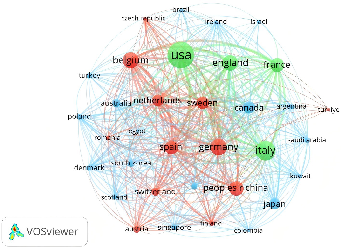 Network visualization using VOSviewer software depicts connections between countries, represented as nodes of varying sizes and colors. Larger nodes include the USA, Germany, and Spain, indicating higher connectivity or significance. Lines between nodes represent relationships or collaborations between countries.