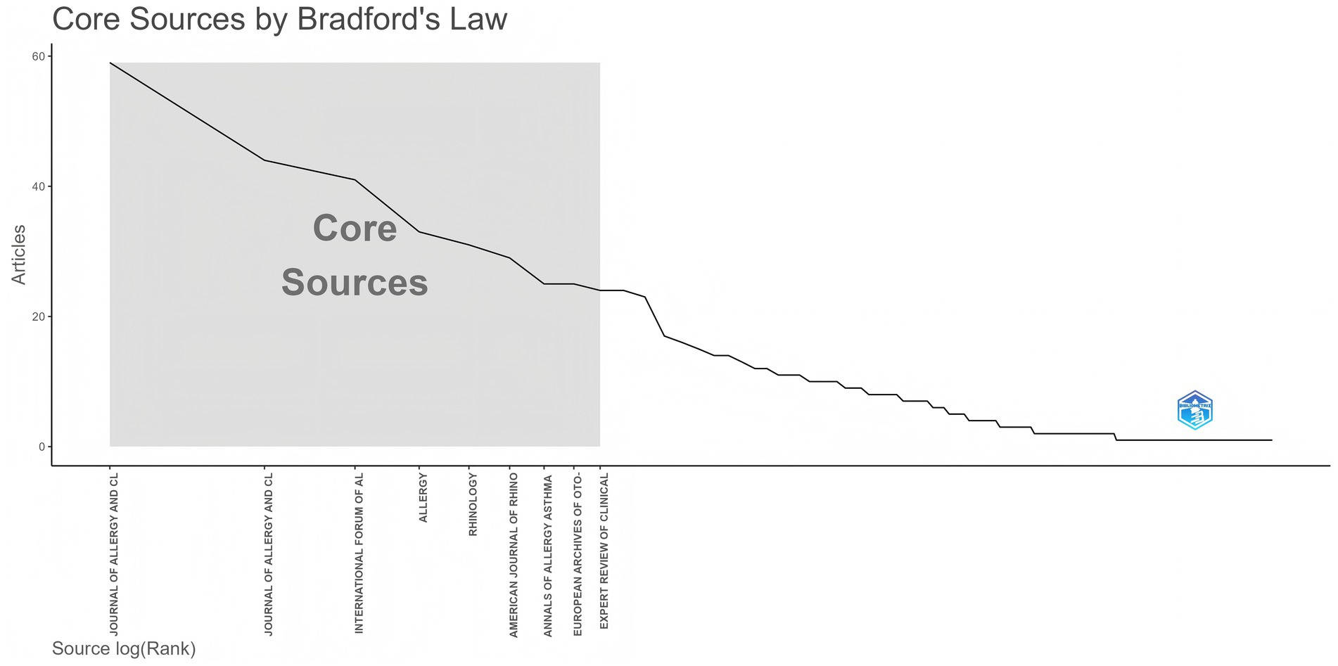 Figure 6. Analysis of academic journals related to biologic treatments for CRS, based on Bradford’s law. Bradford’s Law reveals the concentration of literature—a small number of core journals contribute most important papers. Top journals are the absolute core of the field, carrying the highest density of important literature.