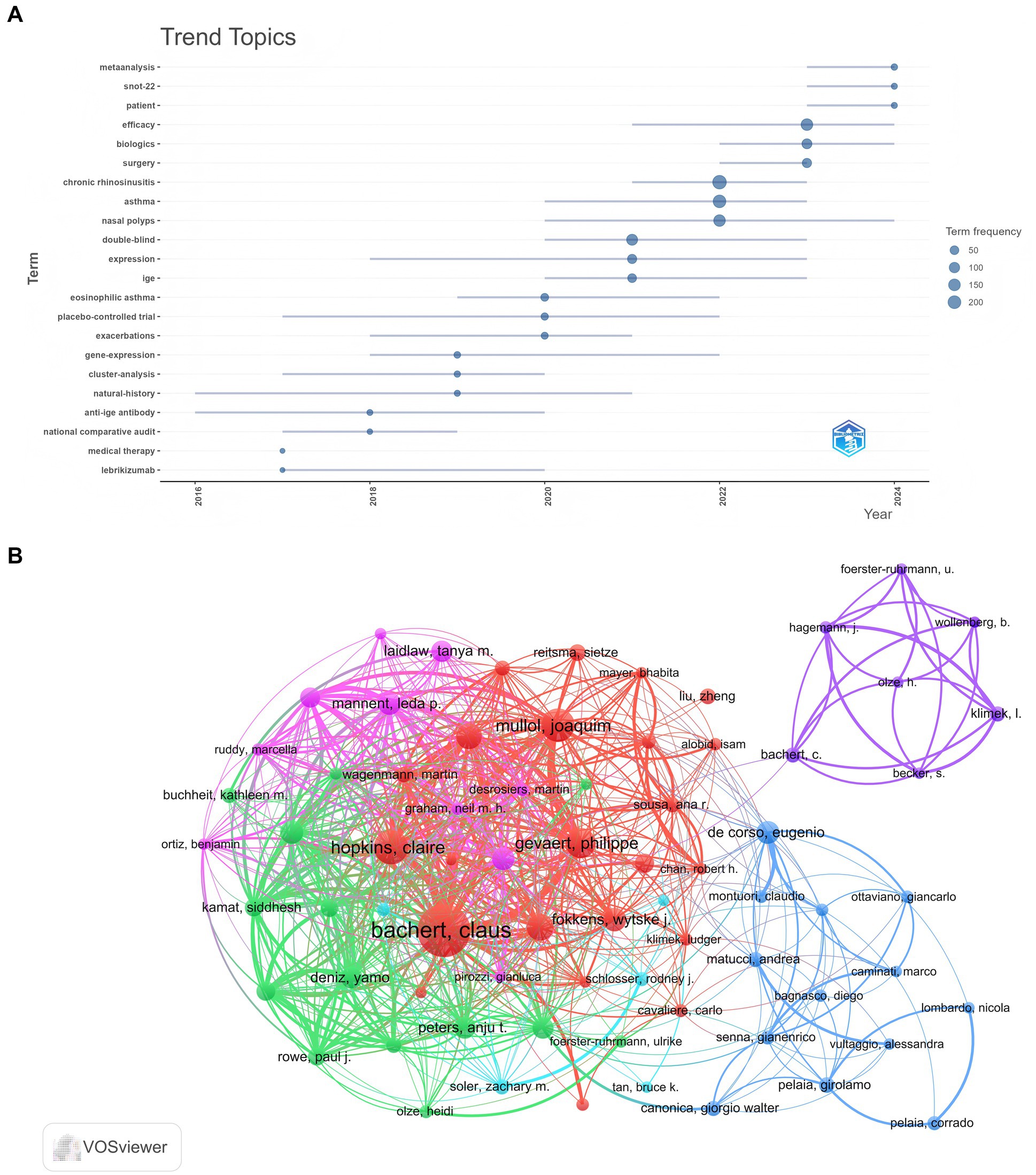 Figure 7. (A) Trend topic analysis of biologic treatments for CRS, covering themes from 2011 to 2024. The timeline illustrates the temporal progression of key research themes, with fluctuations in their prominence. Larger nodes indicate increased frequency and significance of these themes. (B) Analysis of authors in biologic treatments for CRS. The varied colored nodes (73 in total) represent authors in different clusters. The node size reflects co-occurrence frequencies, while the linkages represent co-occurrence relationships between authors.