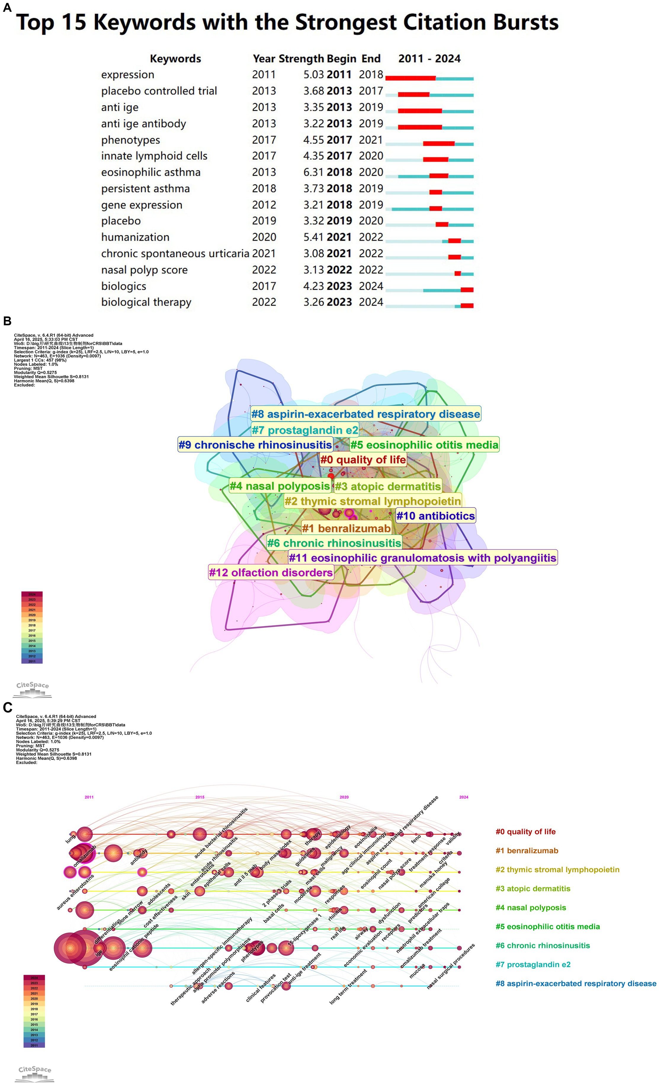 Burst word detection algorithms reveal emerging research trends by analyzing the rate of increase in keyword occurrences. The red line represents the burst period, while the blue line indicates the time intervals. Popular research frontiers are examined based on the timing and duration of keyword bursts. Figure 8A presents the top 15 keywords with the most significant citation bursts. The five most intense keywords, in terms of explosive growth, are: expression (5.03), placebo-controlled trial (3.68), anti-IgE (3.35), anti-IgE antibody (3.22), and phenotypes (4.55). Notably, “biologics” and “biological therapy” continue to exhibit persistent bursts, suggesting that targeted therapy will continue to dominate the future of CRS research.