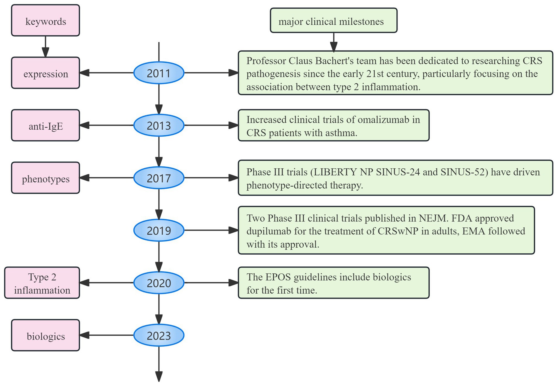 Timeline flowchart details major clinical milestones in researching CRS pathogenesis from 2011 to 2023. Notable events include anti-IgE treatments in 2013, phenotype-directed Phase III trials in 2017, dupilumab approval in 2019, and EPOS guidelines including biologics in 2020.
