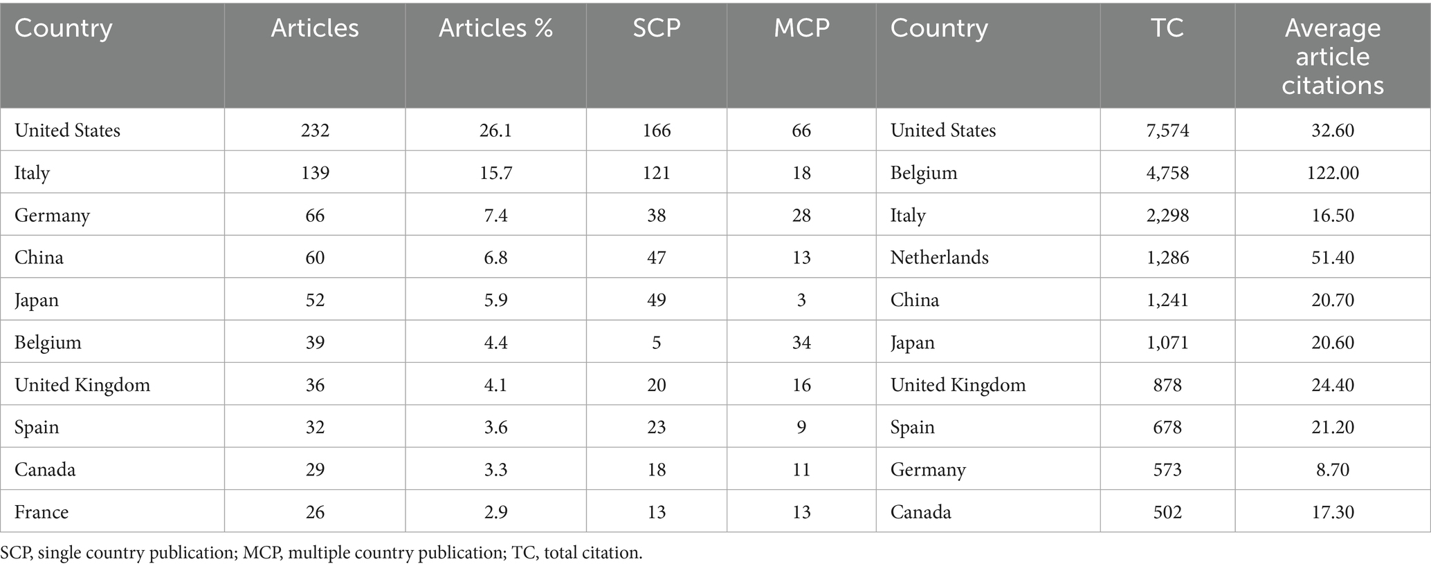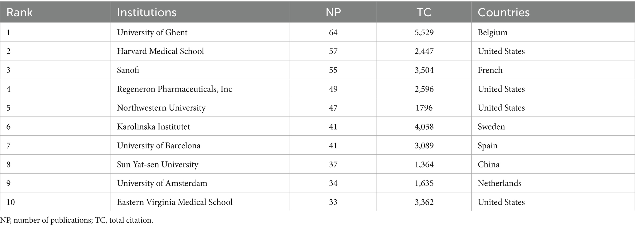 Among the top 10 institutions by publication count, Ghent University stands out as the most productive, with 64 publications and 5,529 total citations. It is followed by Harvard Medical School (n = 57) and Sanofi (n = 55; Table 2). These institutions not only contribute significantly in terms of publication volume but also in terms of impact. For example, while Karolinska Institutet ranks sixth in publication count (n = 41), it ranks second in total citations (TC = 4,038), reflecting the high quality and influence of its research.