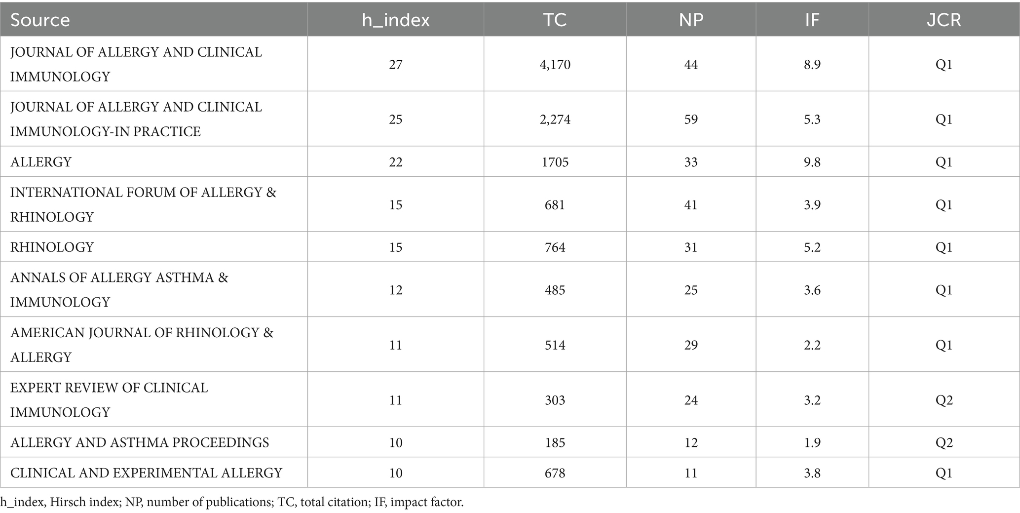 To identify active and influential journals, a visual analysis of the journals publishing research on biologic treatments for CRS was conducted. A total of 888 publications across 183 academic journals were identified. As shown in Table 3 and Figure 6, the Journal of Allergy and Clinical Immunology led with the most publications (NP: 59), followed by the Journal of Allergy and Clinical Immunology-In Practice (NP: 44). Among the top 10 journals, Allergy boasts the highest impact factor (9.8), underscoring its significant influence in the field of biologic treatments for CRS.
