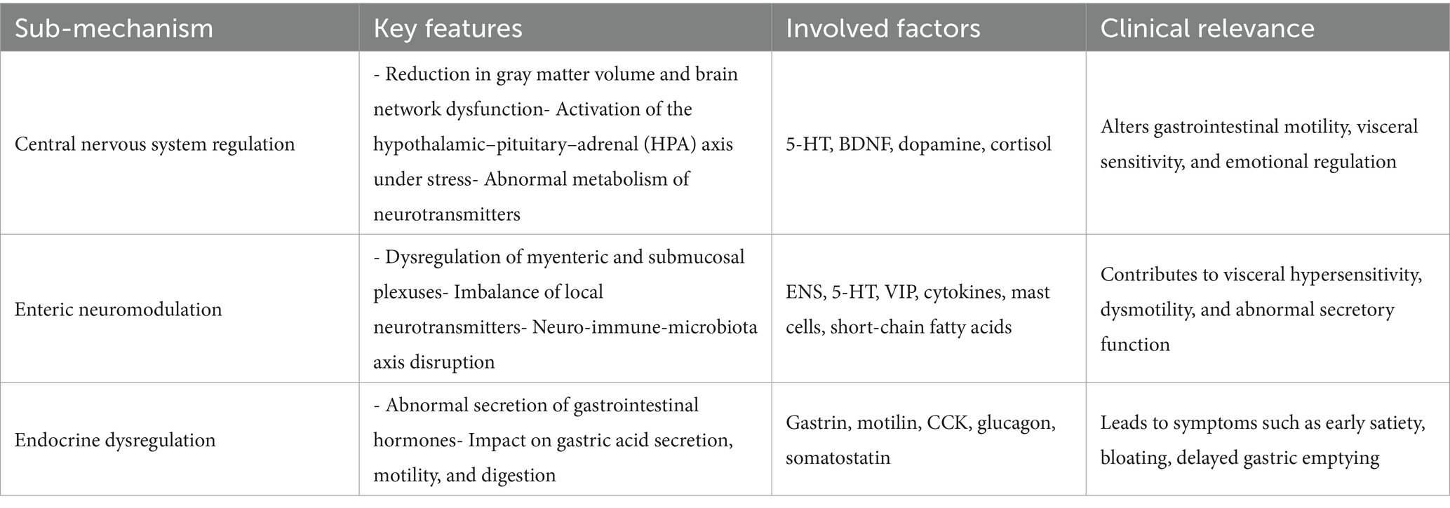 The central nervous system regulates gastrointestinal tract function through complex neural pathways and neurotransmitters. The brain-gut axis refers to the bidirectional communication between the central nervous system and the gastrointestinal tract, mediated by neural, endocrine, and immune pathways. Increasing experimental and clinical evidence supports its crucial role in functional gastrointestinal disorders, including FD, highlighting its relevance for both pathophysiology and potential therapeutic strategies (74). Neuroimaging studies have reported that some FD patients exhibit alterations in brain networks, which may be associated with abnormal gastrointestinal sensation and motility (75, 76). However, these findings are not consistent across all studies, and such changes are not present in all patients. Further research is needed to clarify which subgroups of FD patients demonstrate brain network alterations and how these relate to clinical symptoms. Wachowska-Kelly et al. (77) showed abnormalities in dopamine signaling pathways in FD patients, which may lead to gastrointestinal dysfunction. Brain-derived neurotrophic factor (BDNF) has also been suggested to play an important role in the pathogenesis of FD, and Ly et al. (78) found that the level of BDNF was significantly reduced in patients with FD, which may lead to abnormalities in the regulation of gastrointestinal tract function by the central nervous system. The regulation of the central nervous system involves not only the action of neurotransmitters, but also the influence of emotional and psychological factors. Mohajerani et al. (79) showed that FD patients have a higher prevalence of anxiety and depression, and that psychological stress affects gastrointestinal function through the central nervous system, which may exacerbate FD symptoms. Under stress, the body releases stress hormones such as cortisol, which affects the motor and secretory functions of the gastrointestinal tract through the hypothalamic–pituitary–adrenal axis (HPA axis). In addition, psychological stress can affect the sensory function of the gastrointestinal tract through the vagus nerve, leading to enhanced perception of normal physiological stimuli in the gastrointestinal tract, which in turn triggers or aggravates FD symptoms.