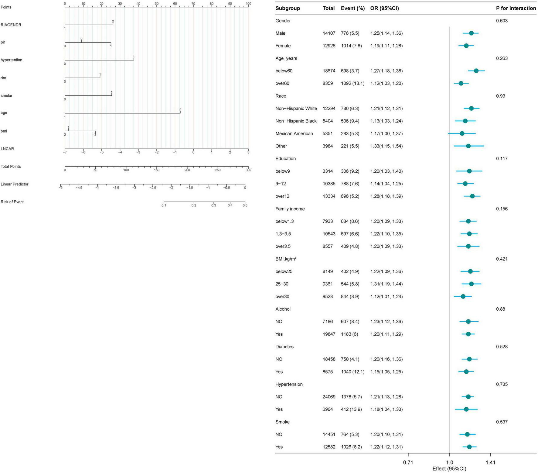 This study included a total of 20,733 patients, among whom 1,744 individuals (4.95%) were diagnosed with RA. After controlling for all covariates, the results of multivariate logistic regression analysis indicated a statistically significant correlation between higher Ln(CAR) levels and the increased incidence of RA (OR:1.77 (95% CI, 1.39–2.25); p < 0.001). The interaction test results showed that there was no statistically significant influence in this specific association. RCS regression modeling demonstrated a linear relationship between Ln-CAR and RA risk. After variable screening, we constructed an RA prediction model incorporating CAR, and the results were visualized using a nomogram. The area under the curve (AUC) was 0.749 (95% CI, 0.738–0.760), and DCA indicated that the model holds clinical significance.