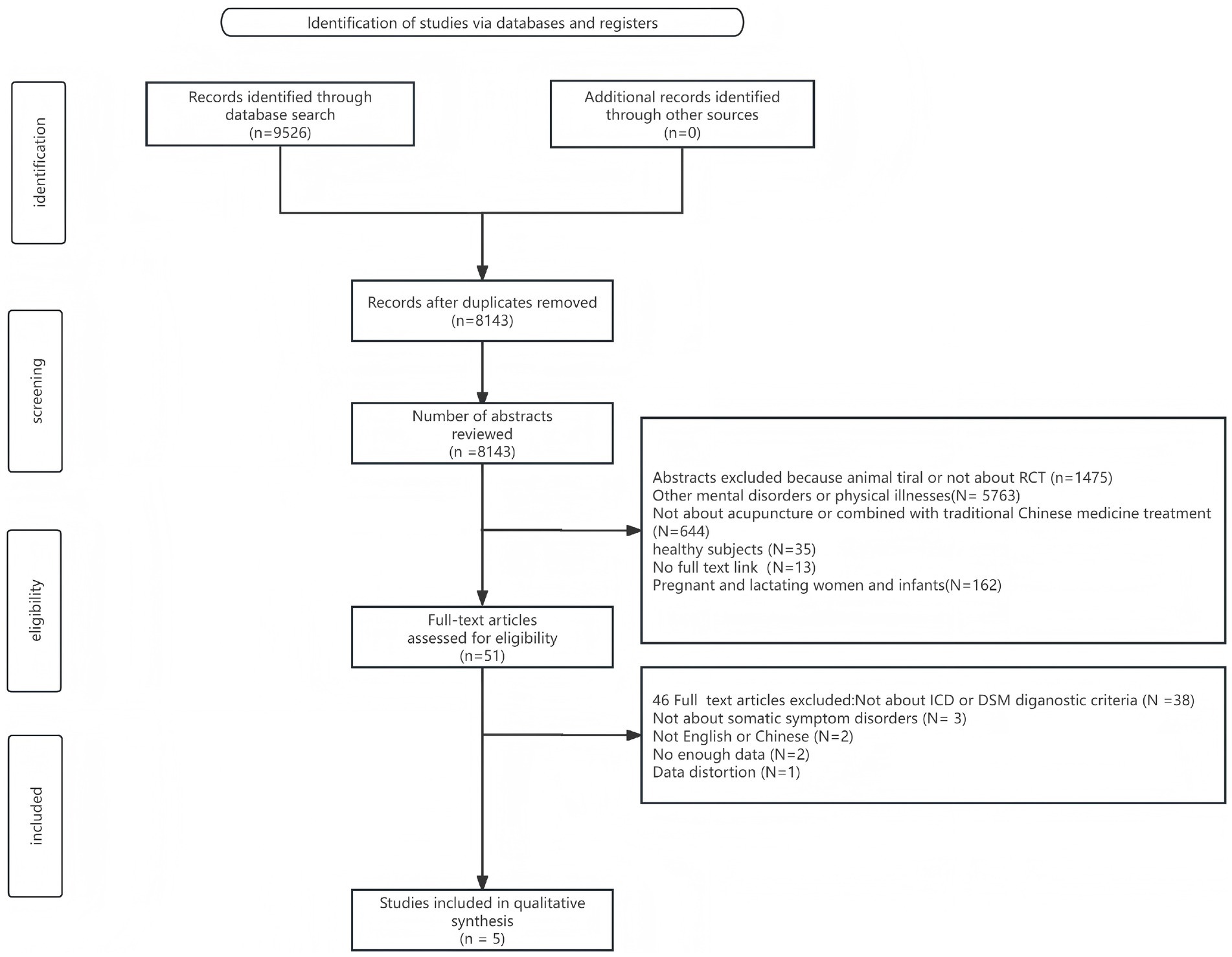 Studies that met all of the following criteria were included in this review: (a) patients were diagnosed as “somatic symptom disorder” or “bodily distress disorder (BDD)” according to the Diagnostic and Statistical Manual of Mental Disorders, 5th Edition (DSM-5 TM) or International Classification of Diseases 11th Revision (ICD-11), regardless of age, sex, and severity of the disease; (b) at least one group of interventions in the study was acupuncture alone or acupuncture in combination with other conservative or pharmacological treatments; (c) the type of study design was randomized controlled trial; (d) outcomes included, but not limited to, Hamilton Depression Scale (HAMD), the Hamilton Anxiety Scale (HAMA), Symptom Checklist-90 (SCL-90), etc.; (e) the language is limited to Chinese or English.