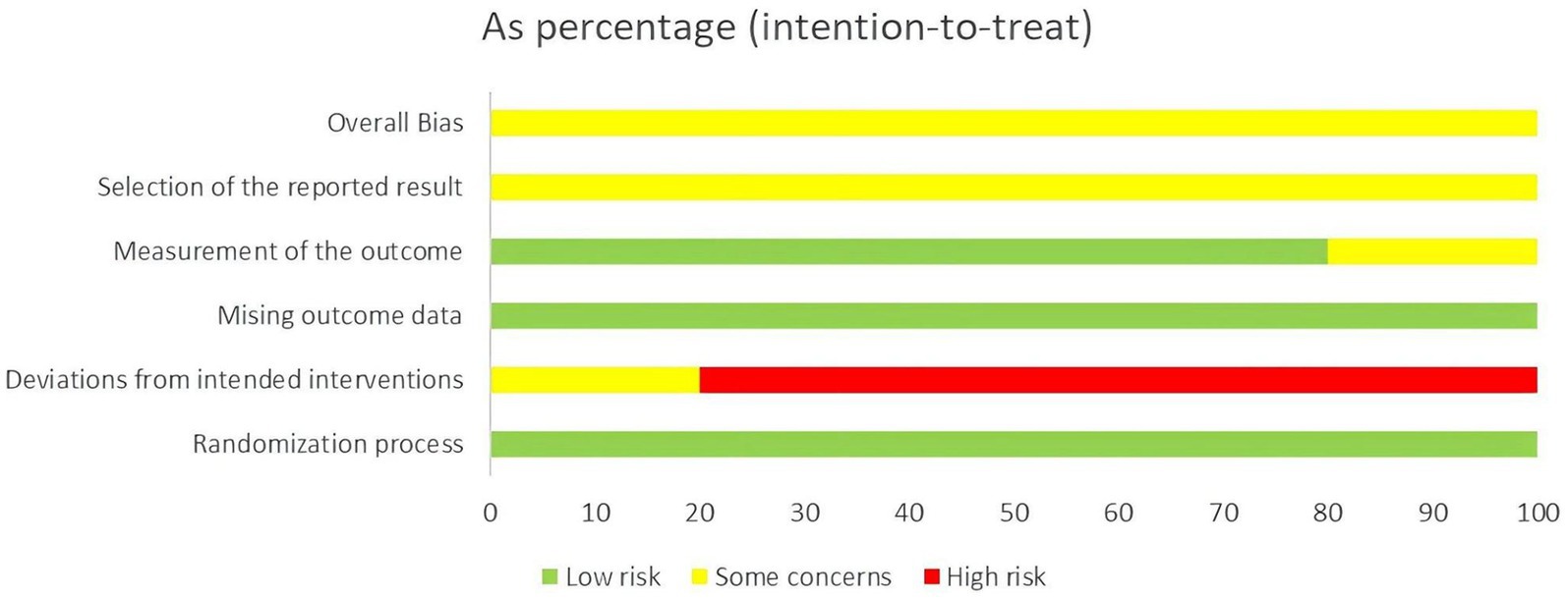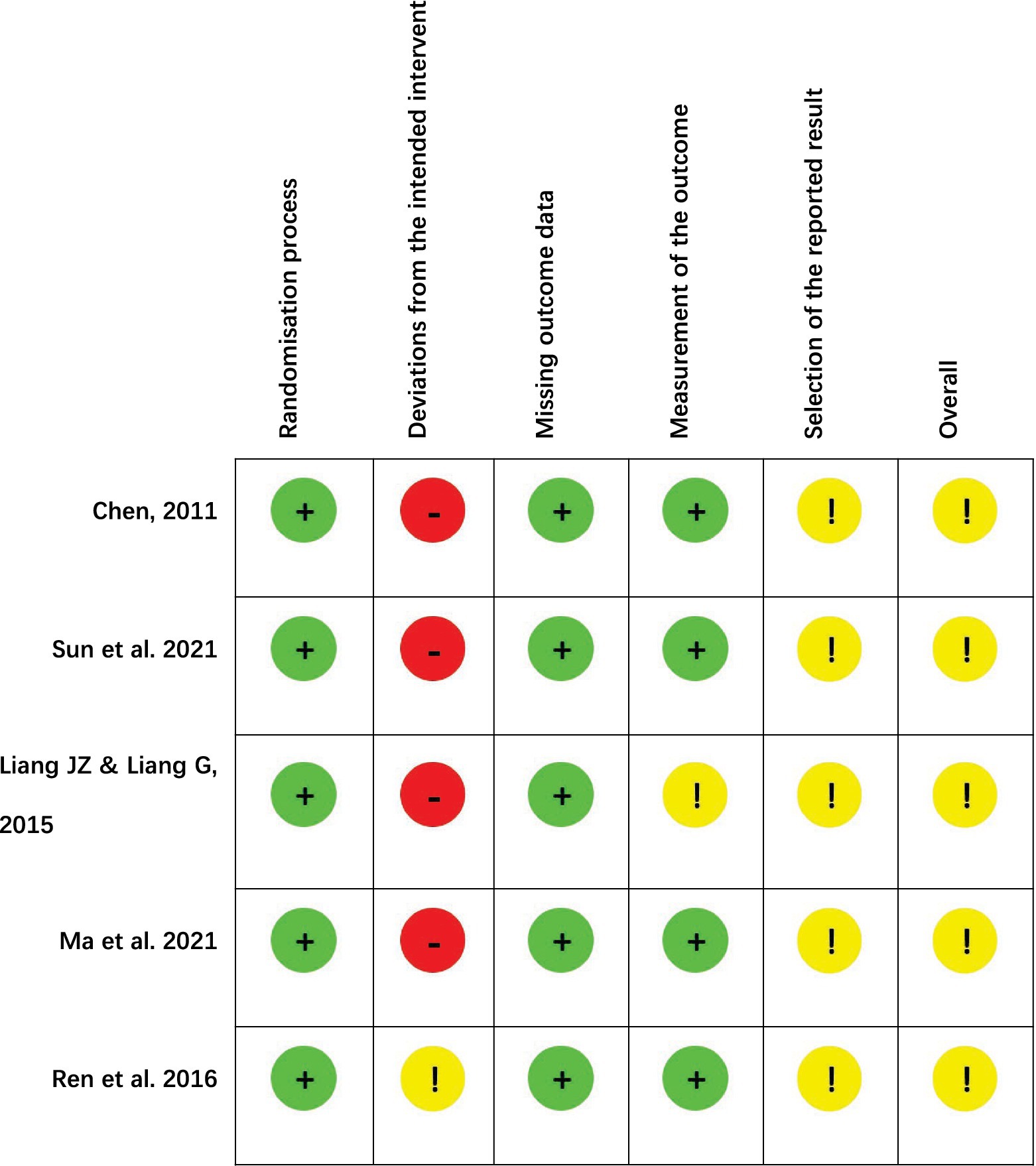 Due to the nature of acupuncture, blinding is often difficult to implement in non-sham acupuncture-controlled trials. One study (26) used simulated floating acupuncture in the control group to blind the patients, but the acupuncturist could not be blinded, so the study was rated as some concern in terms of the deviation of intervention measures. The rest four studies (22–25) adopted medication only in the control group, and it was not possible to blind both patients and treatment providers; therefore, they were rated as high risk of bias under this domain.