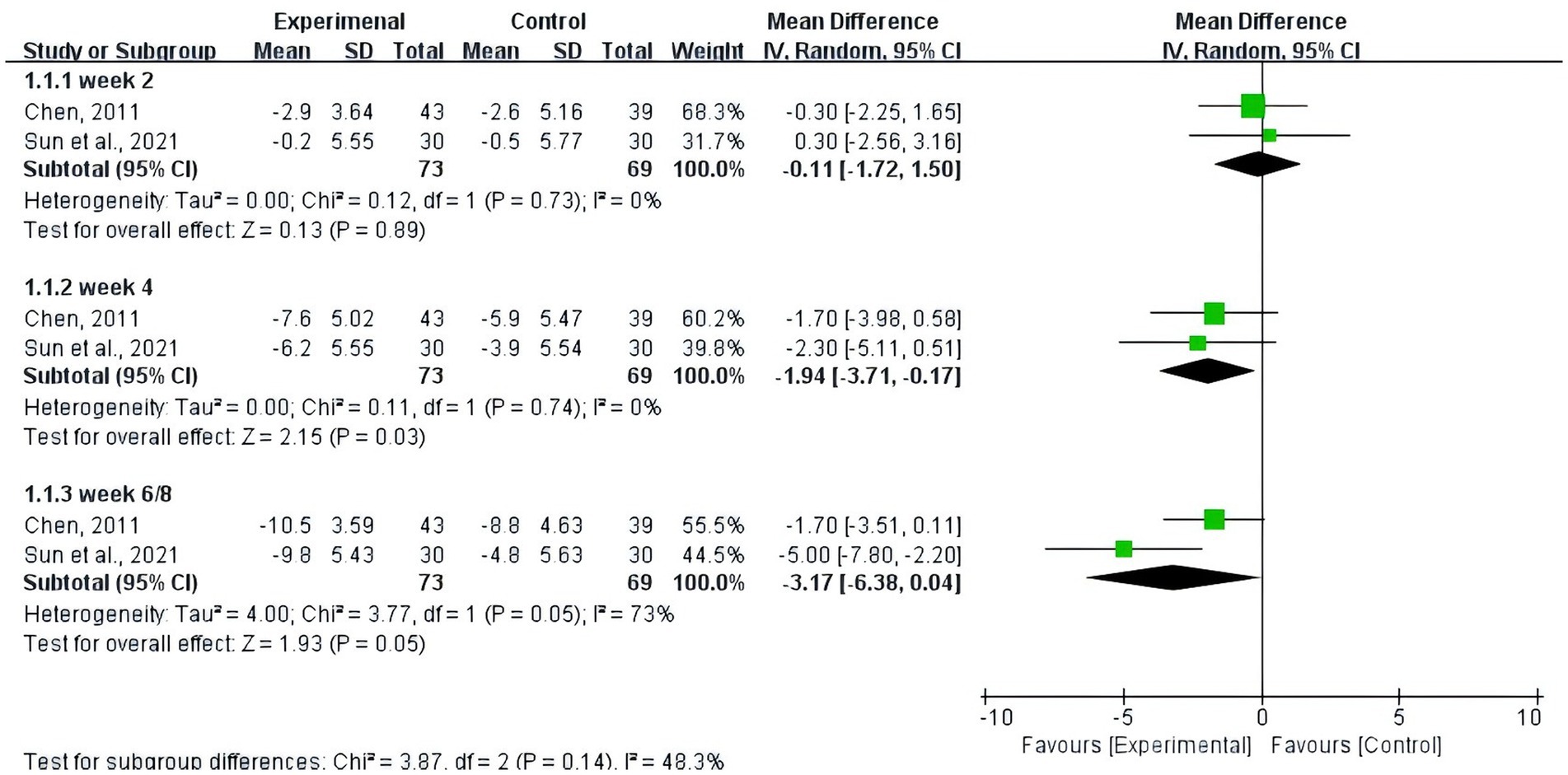 In Ma et al.’s (25) study, the effect of floating acupuncture combined with duloxetine on sleep quality in PSPD patients was evaluated by PSQI, with higher score indicating worse sleep quality. It showed that there was statistically significant difference in the change of PSQI between the experiment and control groups at weeks 1 (−1.75, 95%CI: −3.00 to −0.50; p = 0.007), 2 (−1.77, 95%CI: −2.94 to −0.60; p = 0.004), 4 (−2.35, 95%CI: −3.50 to −1.20; p = 0.0001), and 8 (−1.35, 95%CI: −2.48 to −0.22; p = 0.02) from baseline, respectively (shown in Table 2).