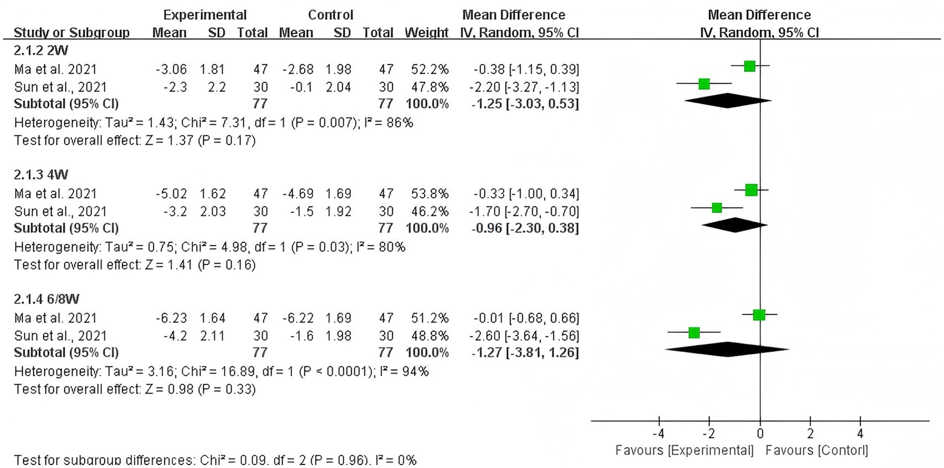 Chen (22) revealed a statistically significant difference in the change of HAMD scores at weeks 2 (−3.3, 95%CI: −5.37 to −1.23; p = 0.002), 4 (−6.70, 95%CI: −8.90 to −4.50; p < 0.0001), and 8 (−5.9, 95%CI: −8.14 to −3.66; p < 0.0001) from baseline between the experiment and control groups (shown in Table 2).