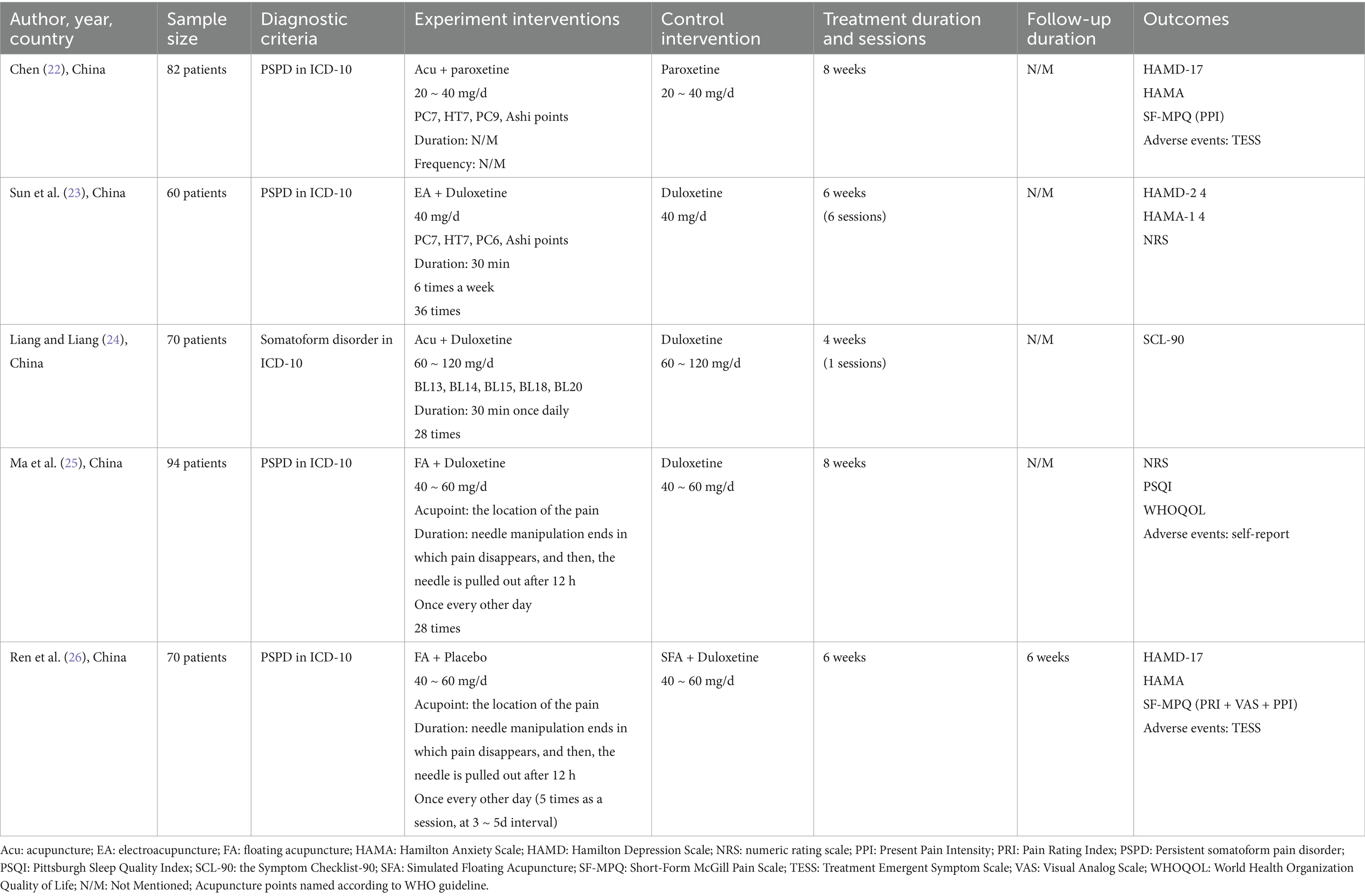 The five studies included were all from China with a total of 376 patient samples (22–26). The studies by Chen (22), Sun et al. (23), Ma et al. (25), and Ren et al. (26) focused on patients with persistent somatoform pain disorder (PSPD, a subtype of SSD), while the other study (24) targeted general SSD patients. All studies reported that the baseline data were comparable. Four of the studies (22–25) used different types of acupuncture combined with antidepressants as the experimental group and antidepressants alone as the control group to evaluate the incremental effect of acupuncture for SSD patients. One study (26) used floating acupuncture combined with a placebo as the experimental group and simulated floating acupuncture combined with antidepressants as the control group. The treatment duration ranged from 6 to 8 weeks, and the reported outcomes included the Hamilton Anxiety Scale (HAMA), Hamilton Depression Scale (HAMD), numeric rating scale (NRS), the Symptom Checklist-90 (SCL-90), Pittsburgh Sleep Quality Index (PSQI), World Health Organization Quality of Life (WHOQOL), and Short-Form McGill Pain Scale (SF-MPQ), including Pain Rating Index (PRI), Visual Analog Scale (VAS), and Present Pain Intensity (PPI) (shown in Table 1).