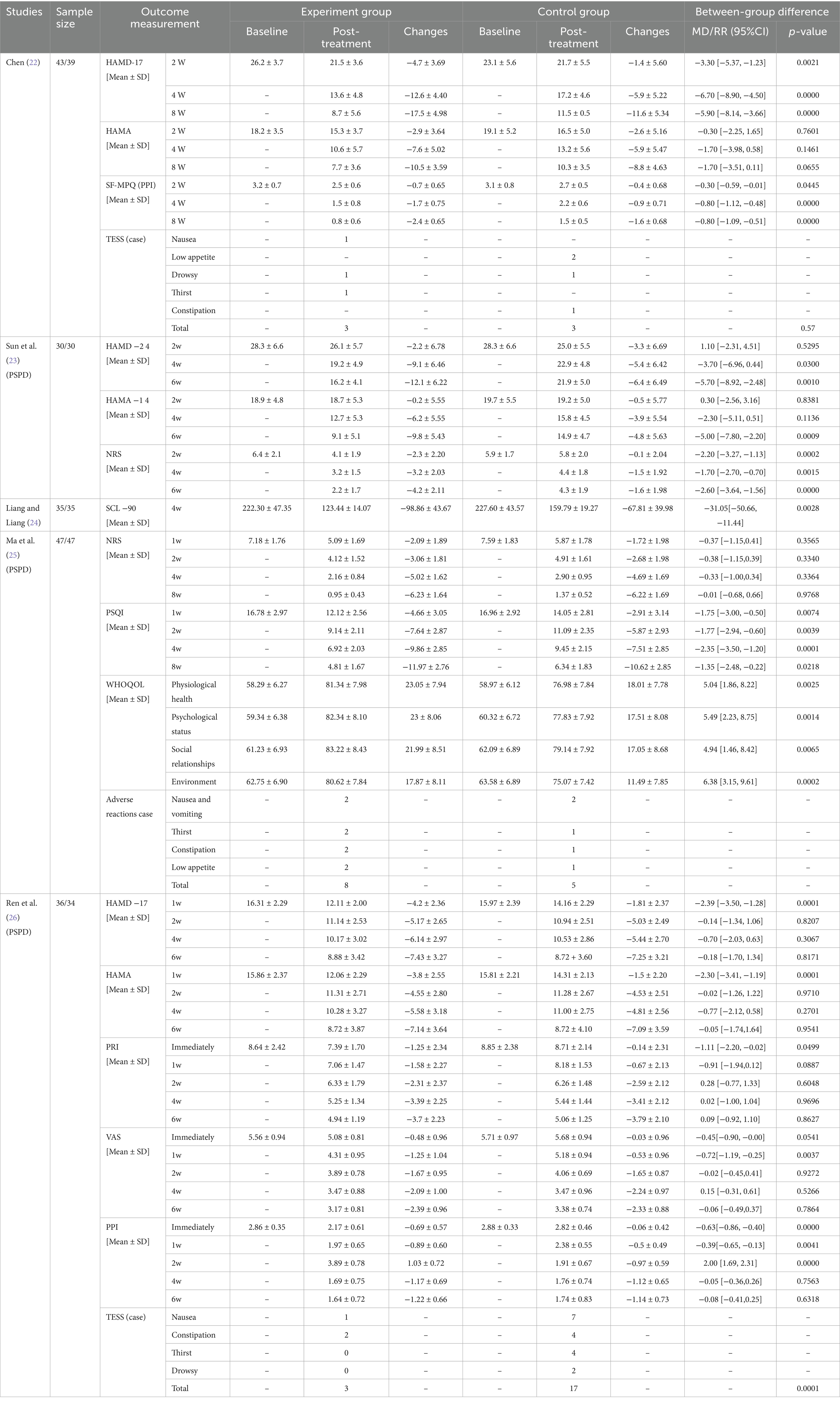 Only Liang and Liang (24) evaluated the severity of somatic symptoms using SCL-90, and the results showed that the between-group difference in the change of SCL-90 scores at week 4 from baseline was statistically significant (−31.05, 95%CI: −50.66 to −11.44; p = 0.003) (shown in Table 2).