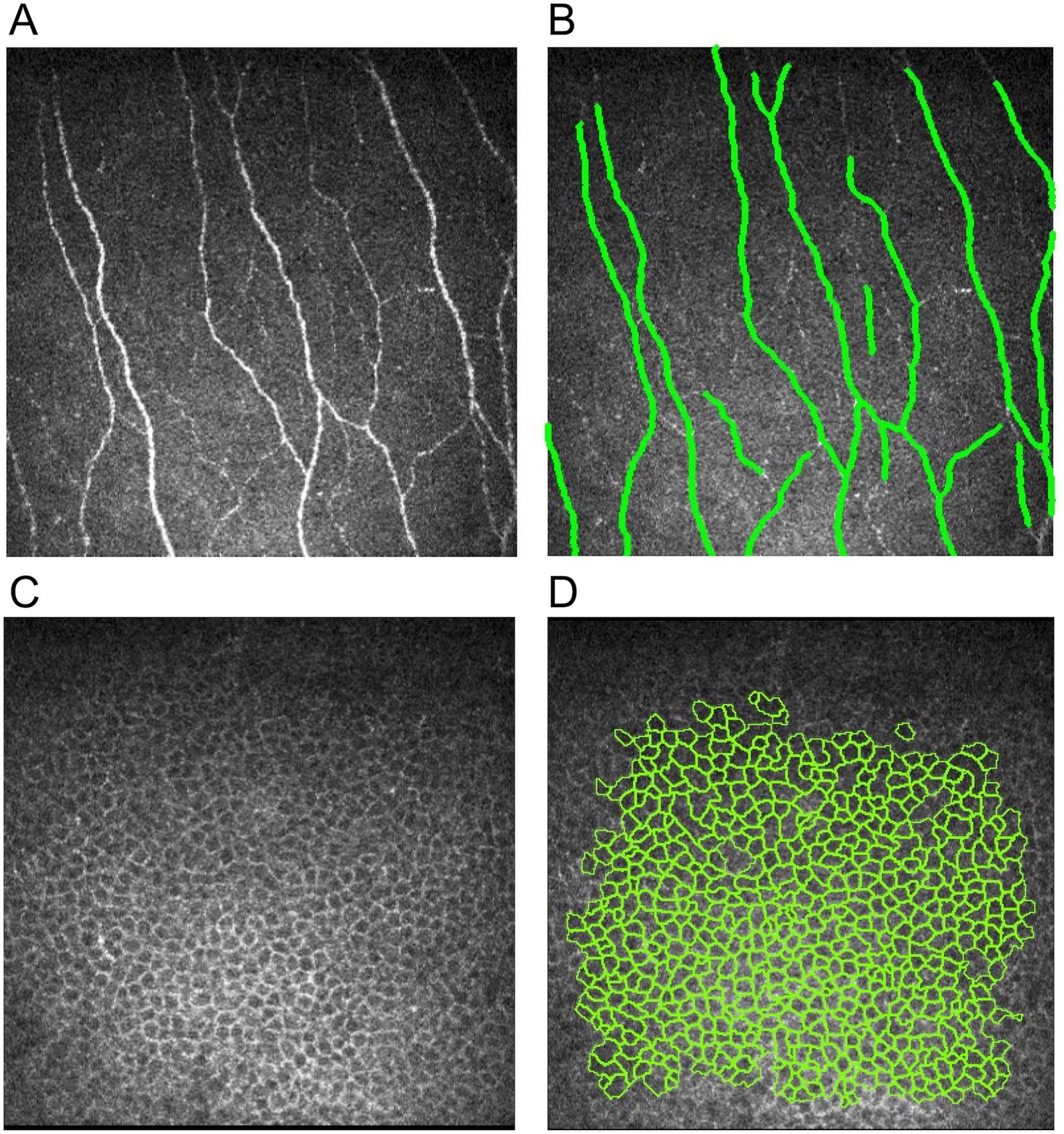 Figure 1. Illustrations of corneal nerve and epithelial cell analysis. (A) Raw nerve image, (B) nerve image annotated by ACCMetrics software, (C) raw corneal epithelial cell image, and (D) epithelial cell image with cell annotation by AIConfocal Rapid Image Evaluation System.