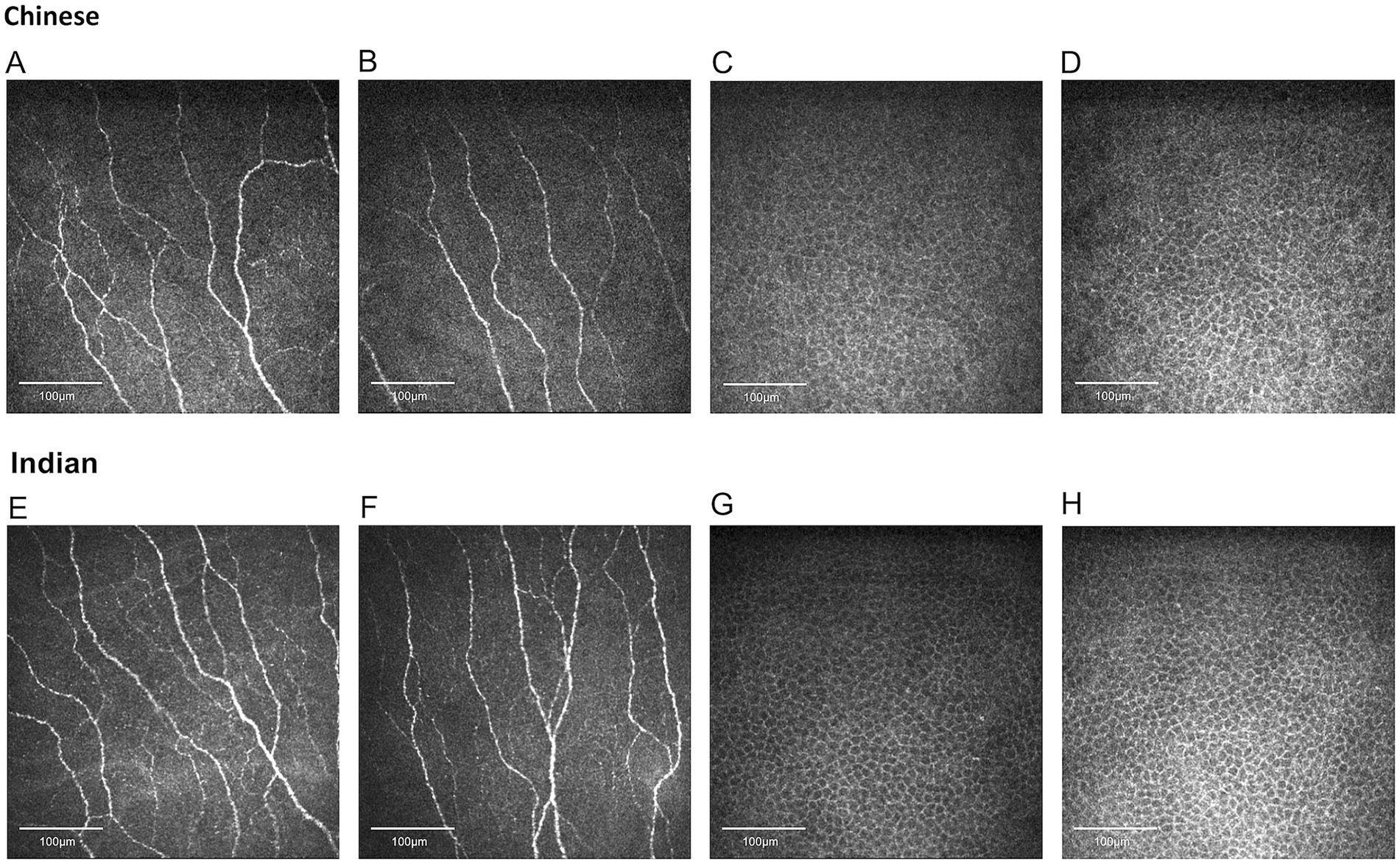 Figure 2. Representative corneal nerve and epithelial cell images for Chinese and Indian participants matched for age and sex. (A,B) Nerve images for Chinese, (C,D) epithelial cell images for Chinese, (E,F) nerve images for Indians, (G,H) epithelial cell images for Indians. Indian individuals demonstrate significantly higher values in corneal nerve fiber length, fiber density, branch density, total branch density, fiber area, fiber width, and fiber fractal dimension. Chinese participants have significantly larger epithelial sizes.