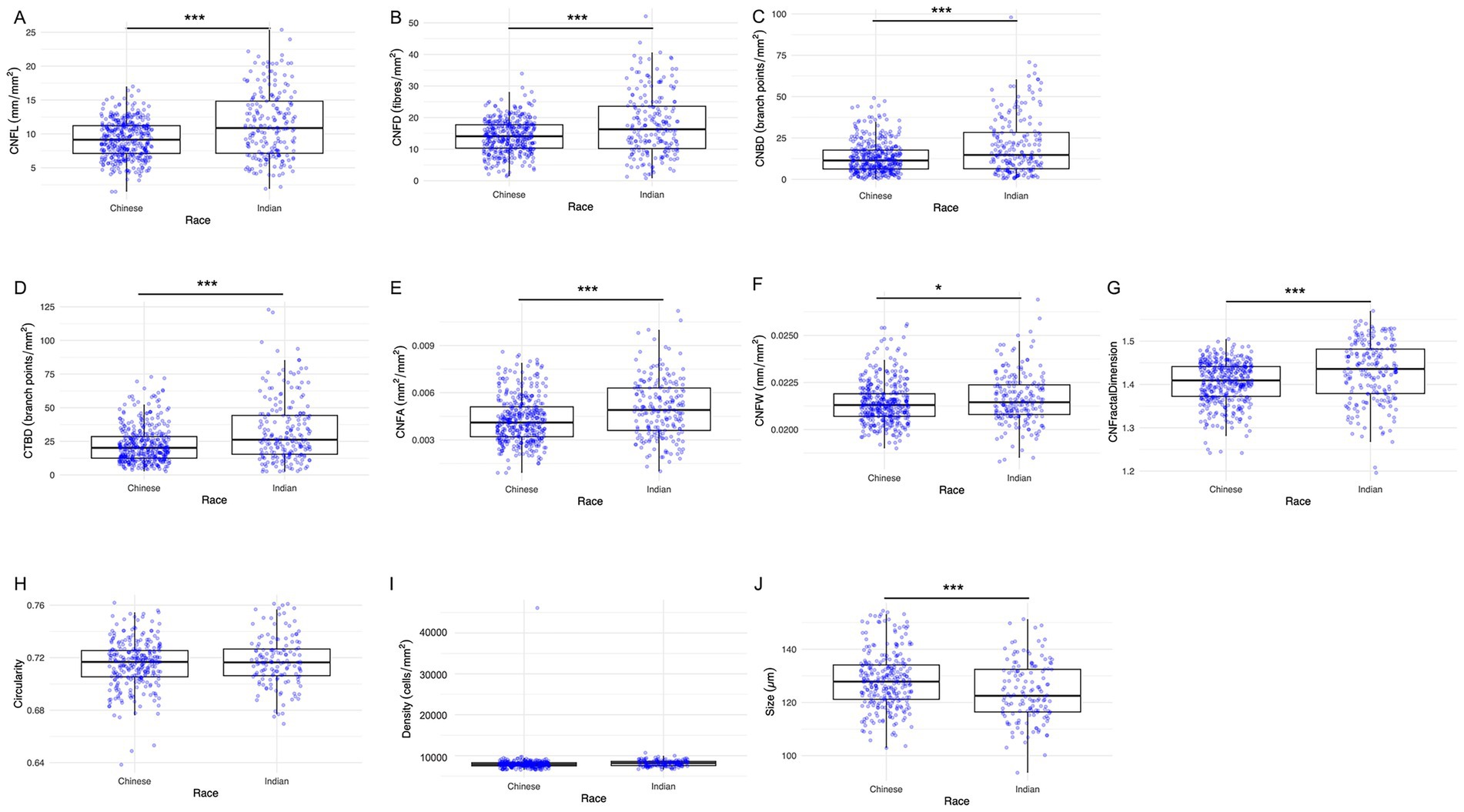 Figure 3. Box and whisker images showing ethnic differences in corneal nerve and epithelial parameters. (A) CNFL, (B) CNFD, (C) CNBD, (D) CTBD, (E) CNFA, (F) CNFW, (G) CNFrD, (H) Epithelial cell circularity, (I) Epithelial cell density, and (J) Epithelial cell size. The lower and upper boundaries of the box show the lower quartile (Q1) and the upper quartile (Q3) range of the data, horizontal line within the box indicating the median (Q2). Outliers beyond the range are depicted as dots. Asterisks indicate level of statistical significance: *p < 0.05, **p < 0.01, ***p < 0.001.