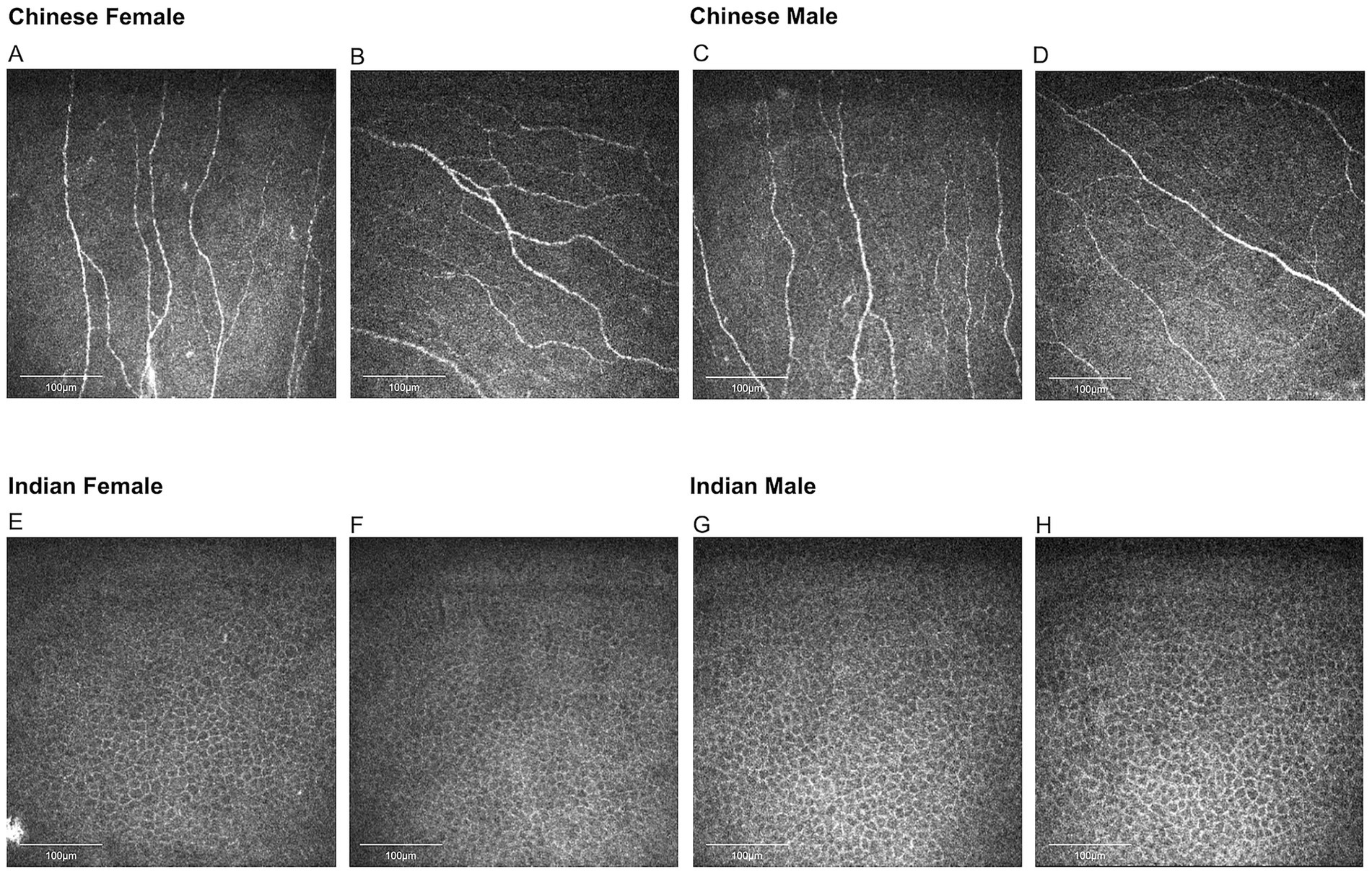 Figure 4. Representative corneal nerve images for Chinese participants and epithelial cell images for Indian participants. (A,B) Nerve images for Chinese females, (C,D) nerve images for Chinese males, (E,F) epithelial cell images for Indian females, (G,H) epithelial cell images for Indian males. Chinese females have significantly higher corneal nerve fiber length, fiber area, and fractal dimension than Chinese males. Indian females have higher epithelial cell circularity compared to Indian males.