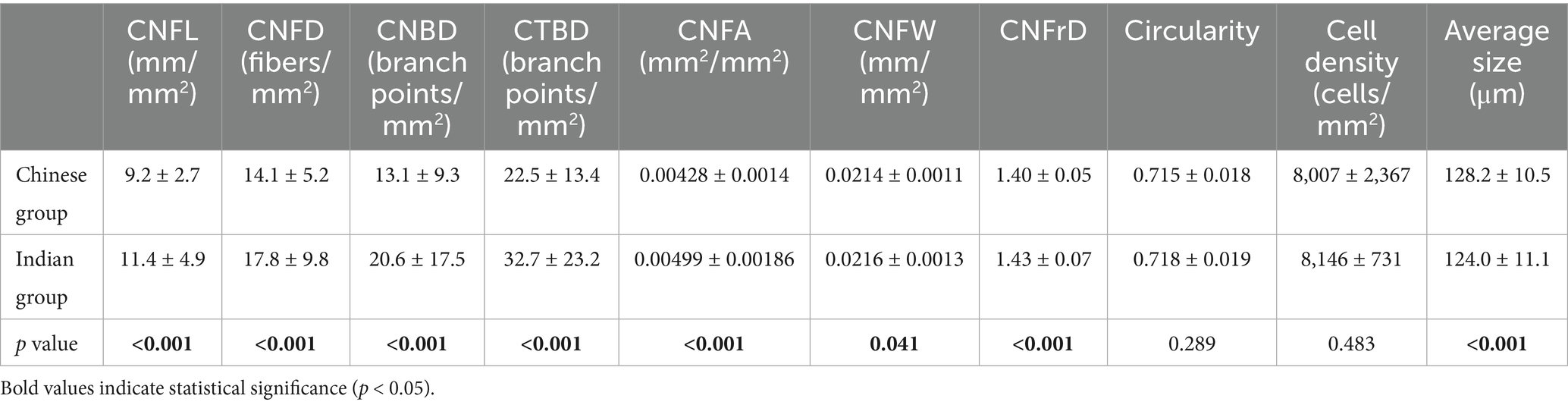 Additionally, we found that Indians have significantly smaller corneal epithelial cell sizes compared to the Chinese. It was suggested that a smaller epithelial cell size may be indicative of higher proliferative activity (46). The basal epithelial cells in the limbus were notably smaller compared to those in the central cornea, which corresponded with the higher proliferative capacity observed in the limbal epithelial cells (47, 48). This is consistent with our data that Indians showed numerically higher corneal epithelial cell density compared to Chinese (8,146 ± 731 cells/mm2 versus 8,007 ± 2,367 cells/mm2), although this difference was not statistically significant (p = 0.483). The corneal nerve plexus contributes to epithelial proliferation by releasing multiple neuromodulators such as epithelial growth factor and ciliary neurotrophic factor (34). Hence, the higher proliferative capacity of epithelial cells in the Indian ethnic group might be due to the better state of the corneal nerve with more neurotrophins secreted, as indicated by the higher nerve parameters in Indians. Ishibashi et al. (49) further reported that corneal epithelial basal cell density is positively and significantly correlated with CNFD and CNBD.