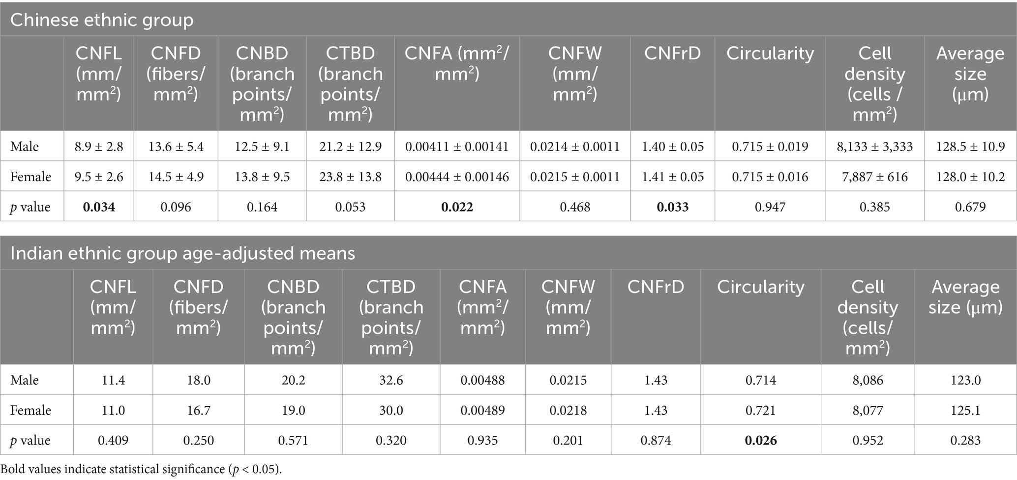 Table 2 represents the detailed results of nerve and epithelial parameters assessed for the two sex groups within each ethnic group. Significant sex-dependent differences in corneal nerve parameters were observed among Chinese participants. Specifically, three corneal parameters were significantly higher in female Chinese participants compared to their male counterparts: CNFL (p = 0.034), CNFA (p = 0.022), and CNFrD (p = 0.033) (Figure 4). For the Indian group, Indian female has higher age-adjusted means for epithelial cell circularity than Indian male participants (p = 0.026) (Figure 4).