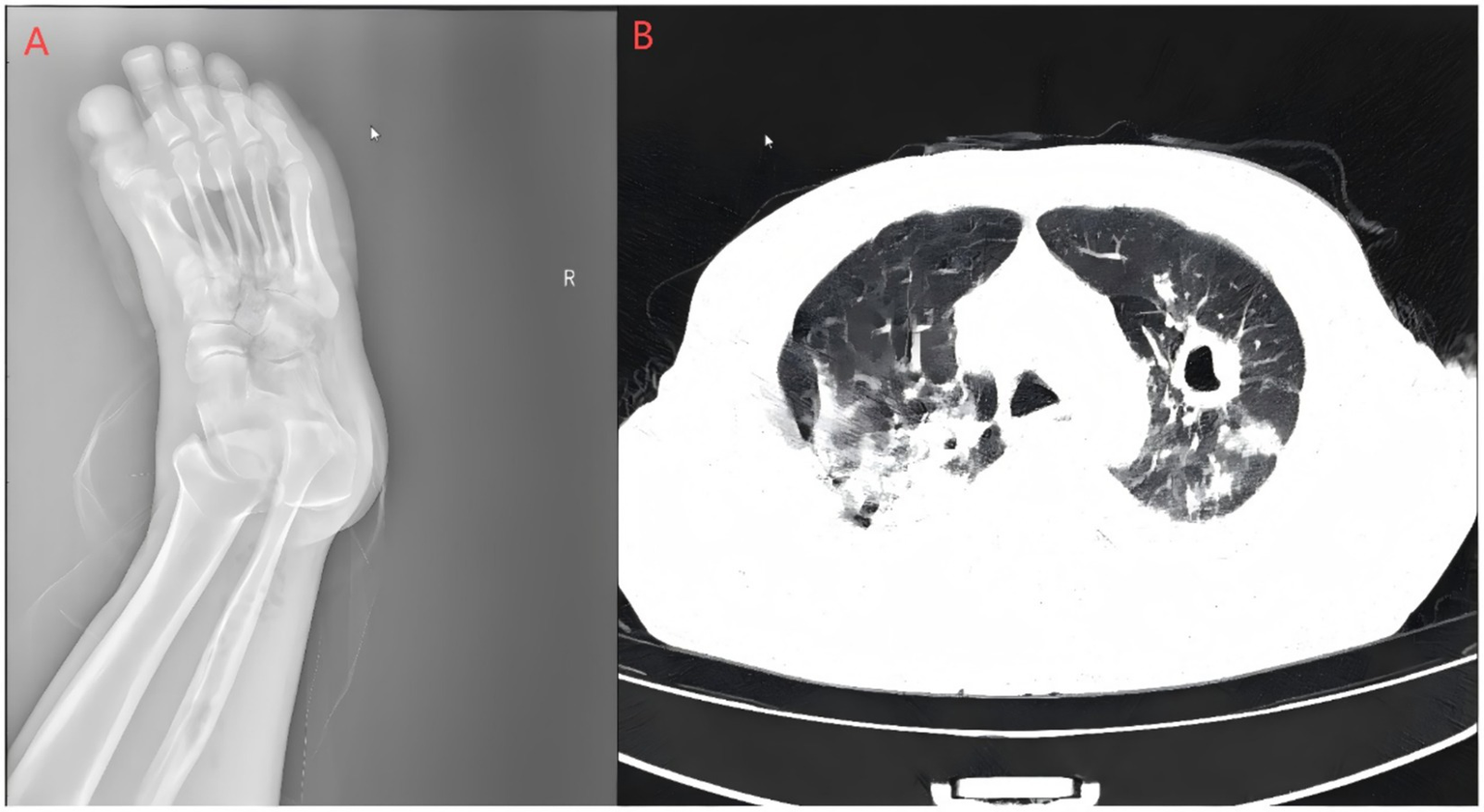 Right foot X-ray and pulmonary CT scan. (A) Bone resorption and destruction can be seen in the first toe of the right foot, and the soft tissue of the right foot is swollen and broken with gas accumulation; (B) polymorphic lung infections with cavity formation bilaterally and a small amount of pleural effusion on both sides. The Supplementary images are available upon reasonable request.
