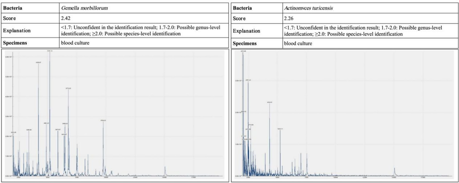 Blood and pleural fluid samples were analyzed by MALDI-TOF mass spectrometry. The causative pathogens were confirmed as Actinomyces turicensis and Gemella morbillorum, with identification scores of 2.26 and 2.42, respectively—both meeting the threshold for species-level reliability.