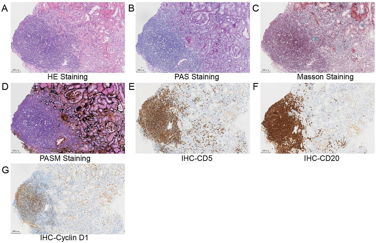 (A–D) Light microscopy study of the renal biopsy specimen revealed mild proliferation of mesangial cells and matrix, diffuse thickening of the glomerular basement membrane (GBM), multifocal atrophy of the tubule, and nodular lymphocytes infiltration in the tubulointerstitial (A) hematoxylin and eosin staining, (B) periodic acid–Schiff staining, (C) Masson trichrome staining, (D) periodic acid silver methenamine staining, and (E–H) immunohistochemical analysis revealed that lymphoblasts were strongly positive for CD5 (E), CD20 (F), and cyclin D1 (G). Scale bars, 100 μm.