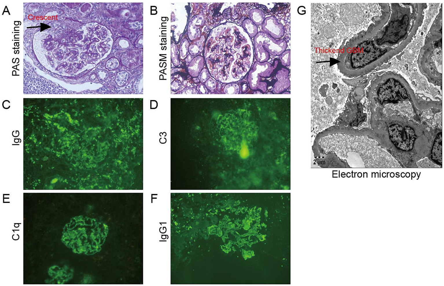 Histopathological findings in the glomerulus. (A,B) The glomeruli showed mild proliferation of mesangial cells and matrix, and there was one segmental cellular crescent formed (arrow) (A) Periodic acid–Schiff staining, ×400; (B) Periodic acid silver methenamine staining, ×400; (C–F) IgG, C3, C1q, and IgG1 granular deposits along the glomerular capillary loops direct immunofluorescence, (C) IgG staining; (D) C3 staining; (E) C1q staining; and (F) IgG1 staining; (G) Electron microscopy showed segmental homogenous thickening of the GBM, with thickness measuring up to 1,000 nm (arrow) (electron microscopy, ×5,000).