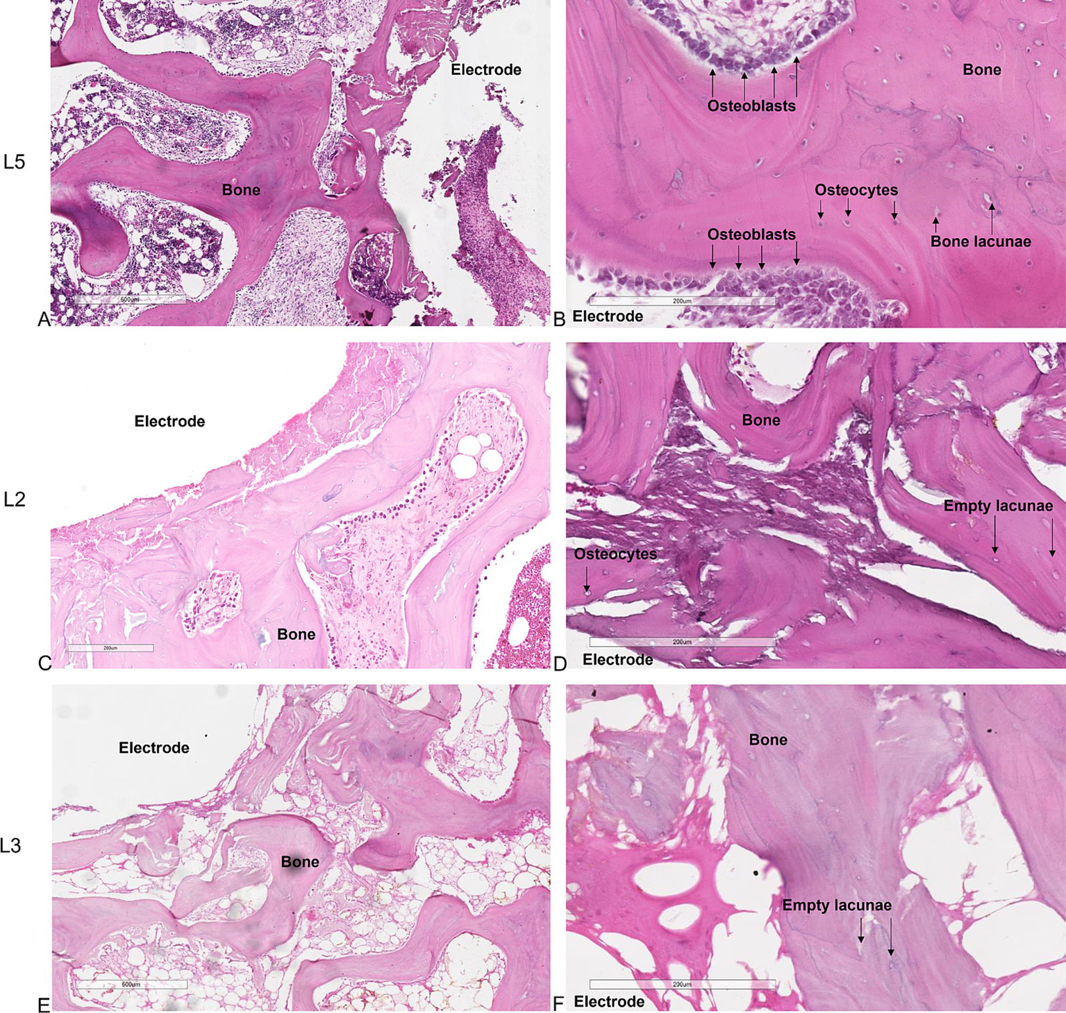Histological analysis of the untreated L5 vertebral body showed preexisting trabeculae among the electrodes entirely covered by osteoblasts, with evident evenly spread osteocytes (Figures 2A,B). These osteocytes were oriented with their longest axis in the direction of the lamellae contained within the bone lacunae, suggesting an active and systematic process of bone remodeling following the intervention. Conversely, in the vertebrae subjected to electroporation (L2, L3 and L4) we did not observe osteoblasts on trabeculae surface and osteocytes within the bone lacunae. In L2 the ablation was limited to the area surrounding the single bipolar electrode (Figures 2C,D). When 2 bipolar electrodes were inserted in the vertebral body (L3 and L4), ablation volume interested the whole vertebral body (Figures 2E,F). This indicates a significant and critical impact of electroporation-mediated ablation on the morphology and vitality of bone cells, potentially influencing the bone healing and regeneration process in the ablated regions.
