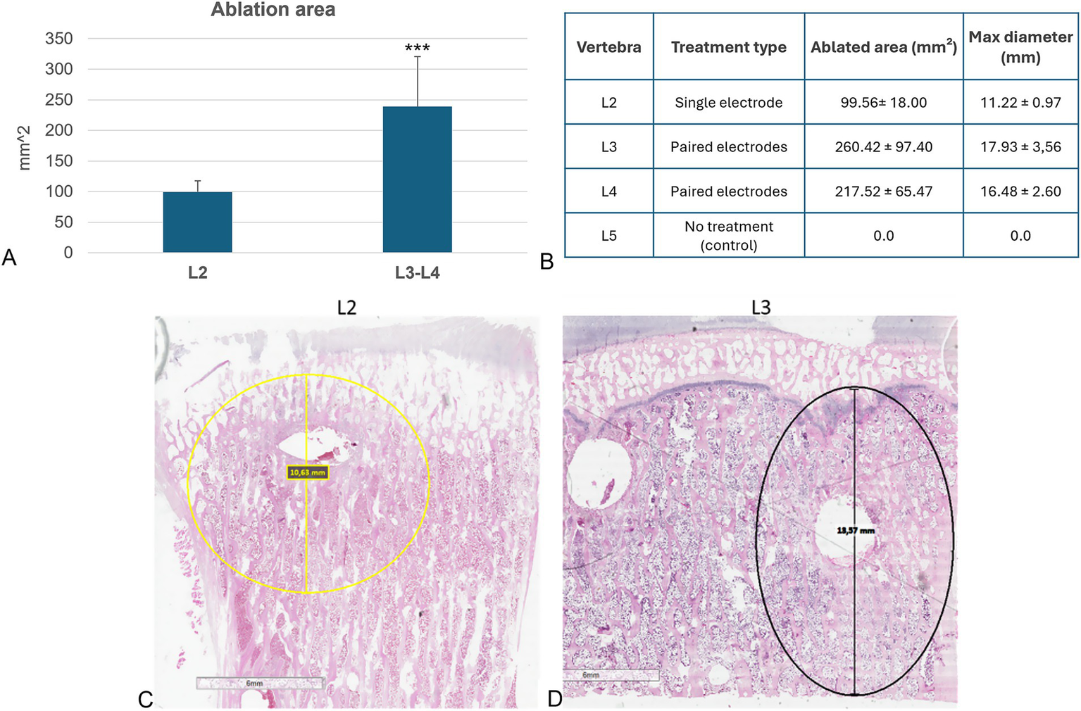 Histological and histomorphometric analyses of vertebral bodies. (A) Histomorphometric measurements of ablated area: L2 versus L3-L4 (Mean ± SD, n = 5): ***, p < 0.0005; (B) Table reporting individual measurements of the ablated area (mm2) and maximum ablation diameter (mm) for each vertebra analyzed. (C) Histological section of L2 vertebra: in yellow the ablated area of L2 vertebra (H&E staining); (D) Histological section of L3 vertebra: in black the ablated area of L3 vertebra (H&E staining).