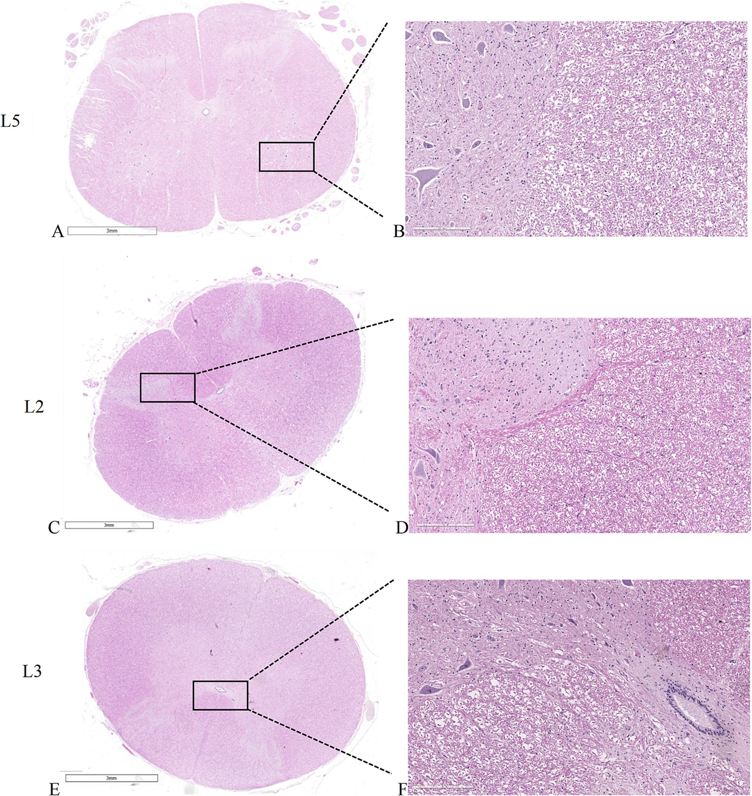Histological sections of the spinal cords. (A,C,E) macro slide view. (A,B) untreated L5 spinal cord. (C,D) spinal cord adjacent to L2 vertebral body where the electric field was applied individually. (E,F) spinal cord adjacent to L3 vertebral body where the electric field was applied as a pair. (A,C,E) × 1 magnification; (B,D,F) × 20 magnification, H&E staining.
