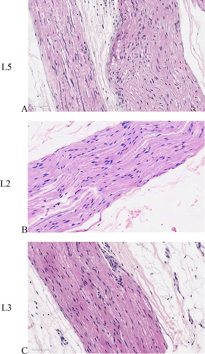 Histological sections of peripheral nerves. (A) untreated L5 peripheral nerve. (B) peripheral nerve adjacent to L2 vertebral body where the electric field was applied individually. (C) peripheral nerve adjacent to L3 vertebral body where the electric field was applied as a pair. ×40 magnification, H&E staining.