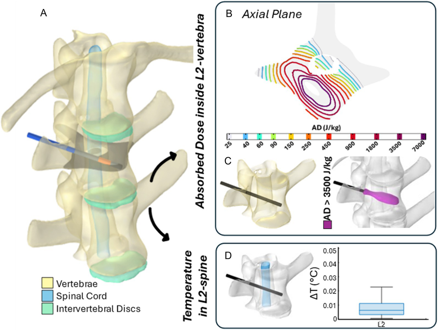 The 3D numerical model and results of simulated EP in L2 vertebra. Simulated treatment for EP-mediated ablation on L2. (A) Vertebral modeling and electrode positioning; (B) absorbed dose distribution (axial view); (C) resulting EP-mediated ablation volume (purple); (D) temperature variation within the spinal cord region highlighted in light blue.