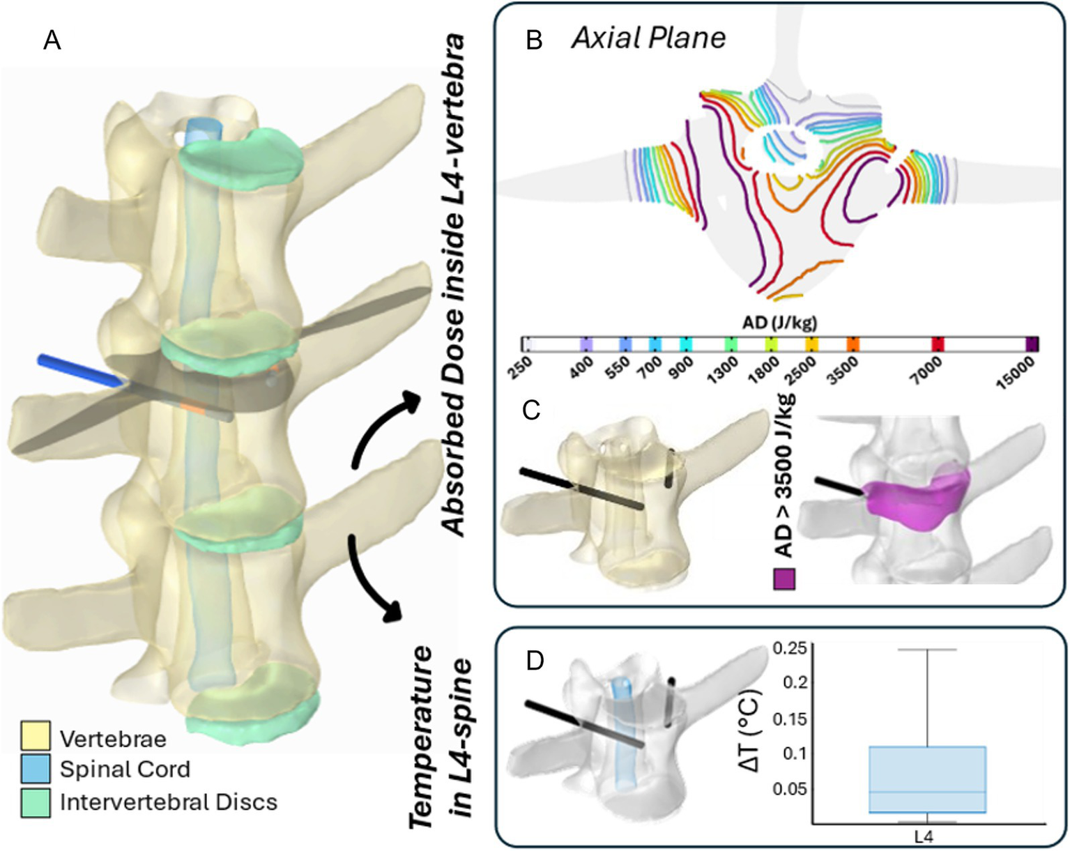 The 3D numerical model and the results of simulated EP in L4 vertebra. Simulated treatment for EP-mediated ablation on L4. (A) Vertebral modeling and electrode positioning; (B) absorbed dose distribution (axial view); (C) resulting EP-mediated ablation volume (purple); (D) temperature variation within the spinal cord region highlighted in light blue.