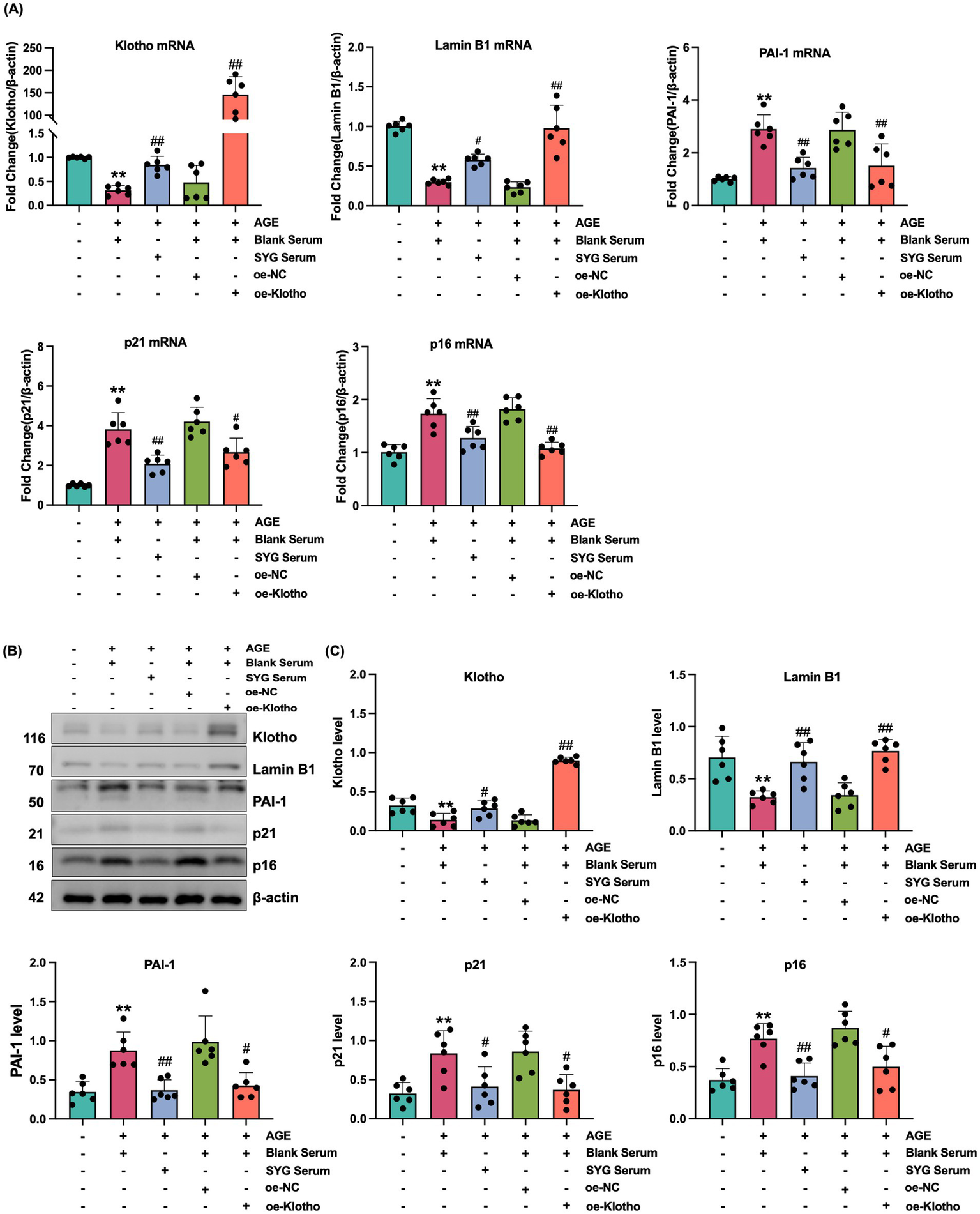 SYG mitigates AGE-induced senescence in HK-2 cells by enhancing Klotho expression. (A) mRNA expression levels of Klotho, Lamin B1, PAI-1, p21, and p16 in control, AGE + Blank Serum, AGE + SYG Serum, AGE + Blank Serum + oe-NC, and AGE + Blank Serum + oe-Klotho groups. (B) Protein expression of Klotho, Lamin B1, PAI-1, p21, and p16 in the same groups. (C) Detailed analysis of protein levels. *P < 0.05, **P < 0.01 compared to the control group, #P < 0.05, ##P < 0.01 compared to the AGE + Blank Serum group.