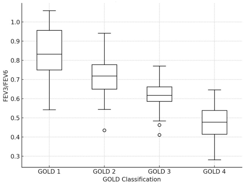 In this study, the main analysis focused on patients with mild to moderate COPD. However, we also present the performance of FEV₃/FEV₆ across the different GOLD stages (mild, moderate, severe, and very severe) to assess its broader utility in COPD diagnosis and prognosis. The results for severe and very severe COPD patients are discussed separately as part of the supplementary analysis to avoid confusion regarding the primary study aim. The distribution of FEV3/FEV6 in different COPD GOLD grades is seen in Table 5 and Figure 4. Figure 4 shows a boxplot of FEV3/FEV6 in different GOLD tiers.