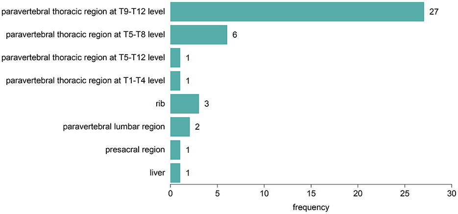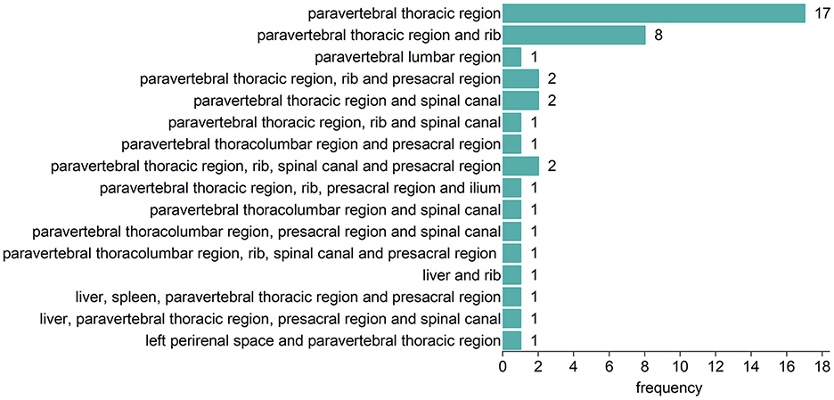 Fifty-eight TDT patients included 42 (72.4%) with EMH masses and 16 (27.5%) without. The anatomical distribution of EMH masses is depicted in Figure 1. The most common site was the paravertebral thoracic region, where EMH masses were identified in 40 (95.2%) of the TDT patients with EMH. EMH masses were also found within the spinal canal in 9 (21.4%) of these patients. Figure 2 illustrates the anatomical sites of the largest EMH mass for each patient with EMH. The largest masses were predominantly located in the lower paravertebral thoracic region at the T9-T12 level, involving 27 (64.3%) of the TDT patients with EMH.