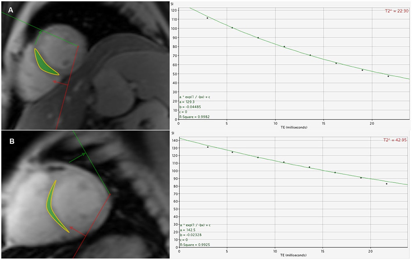 Figure 3. (A) A 26-year-old male β-TDT patient with the homozygous β0 genotypes had a cardiac T2* value of 22.30 ms. (B) A 31-year-old male β-TDT patient with the heterozygous β0β+ genotypes had a cardiac T2* value of 42.95 ms.
