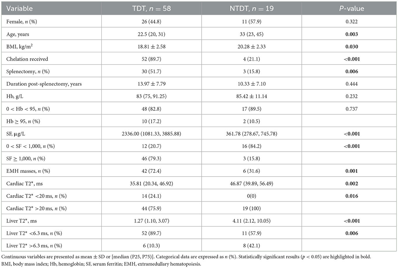 A total of 77 thalassemia patients were included, consisting of 58 TDT and 19 NTDT patients. The median age was 22.5 years for TDT patients, 44.8% of whom were female, and 33 years for NTDT patients, with 57.9% being female.