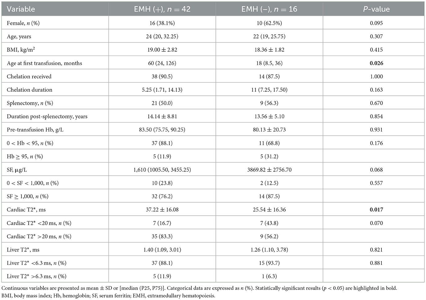 Table 2 compares the clinical and MR characteristics between EMH (+) and EMH (-) TDT patients. Most characteristics were similar between the EMH (+) group and the EMH (–) group, except the EMH (+) group began their first transfusion later (p = 0.026) and had significantly higher cardiac T2* values (p = 0.017).