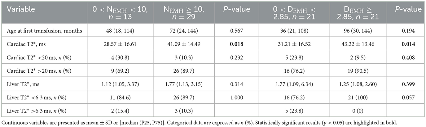 Subgroup analyses were conducted for EMH (+) TDT patients (Table 3). The cardiac T2* values were significantly lower in the 0 < NEMH < 10 group compared to the NEMH ≥ 10 group (p = 0.018). No notable differences were found between groups for the proportion of patients with a cardiac T2* value < 20 ms, liver T2* values, or age at the first transfusion (all p > 0.05). The 0 < DEMH < 2.85 cm group displayed lower cardiac T2* values compared to the DEMH ≥ 2.85 cm group (p = 0.014). No significant differences were found between these two groups regarding the proportions of patients with a cardiac T2* value < 20 ms, liver T2* values, or the proportions of patients with a liver T2* value < 6.3 ms (all p > 0.05). Furthermore, the age at the first transfusion did not differ significantly between the groups.