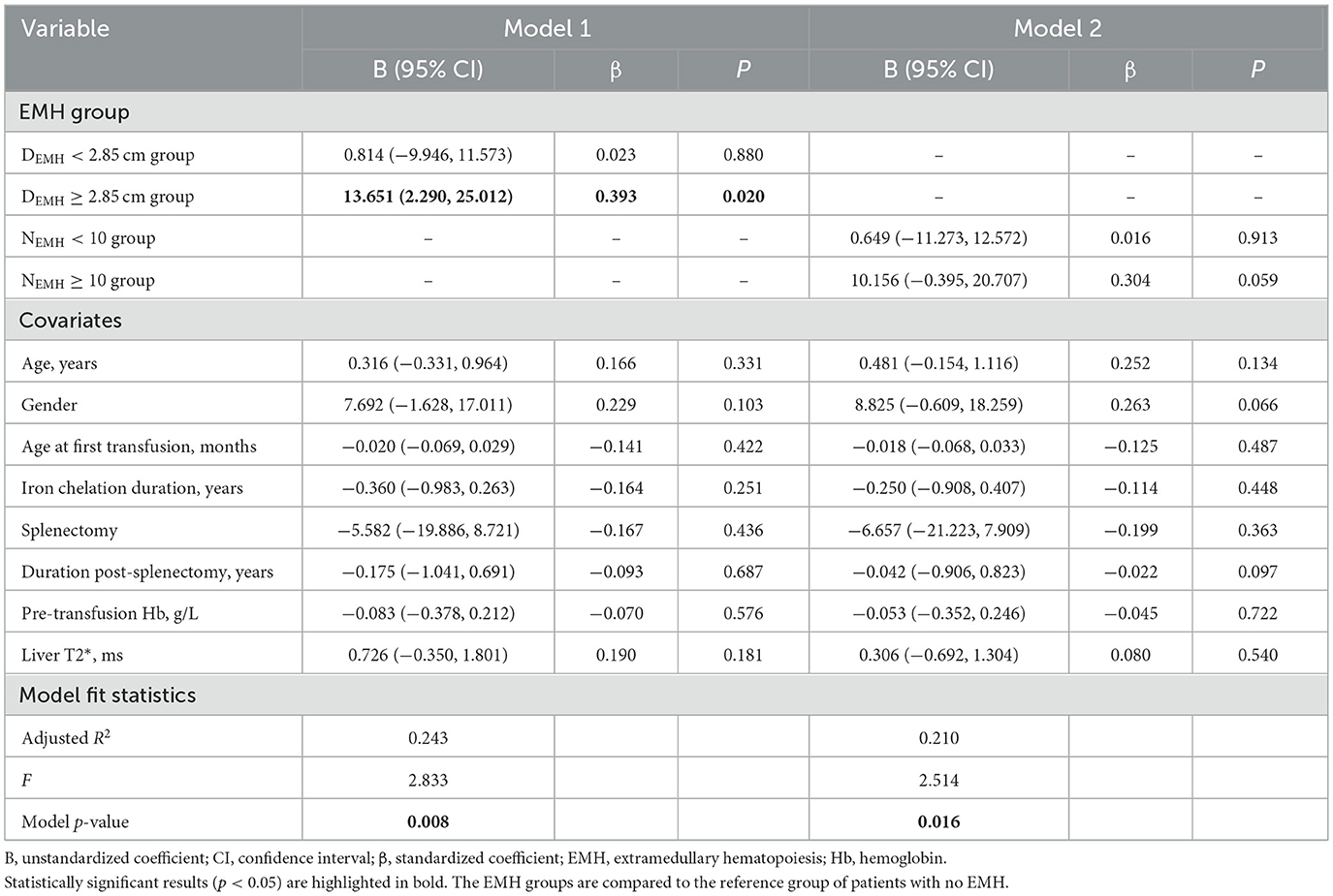 Previous studies have reported EMH prevalence rates ranging from 4.4% to 27% among TDT patients (25, 26, 33–35). However, in this study, a significantly higher prevalence of 72.4% was observed, which exceeds previous reports. This discrepancy may be attributed not only to different sample sizes between studies, but also to the suboptimal transfusion support in our cohort of TDT patients. The median pre-transfusion hemoglobin level in our TDT cohort was 83 g/L, substantially lower than the recommended target of ≥ 95 g/L required to effectively suppress erythropoiesis and prevent EMH (1, 13). This likely stems from broader systemic challenges such as economic constraints and limited blood supply (36). Consequently, our study cohort presents a unique natural experiment demonstrating that TDT patients with inadequate transfusion management can exhibit an EMH prevalence pattern that mirrors, or even exceeds, that seen in NTDT. This finding underscores the critical importance of adhering to recommended transfusion guidelines to mitigate the risk of EMH and its associated complications.