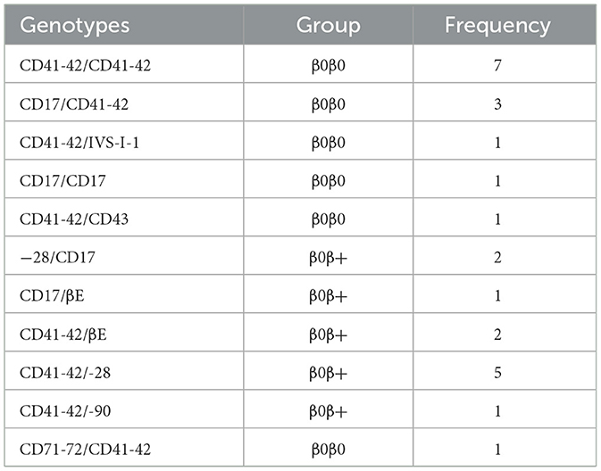 Thalassemia genotypes were collected in 25 of the 58 TDT patients. CD41-41, CD17, and−28 were the most frequent mutations (Table 5). CD41-42/CD41-42, CD41-42/-28, and CD17/CD41-42 were the most prevalent genotypes. The homozygous β0 genotypes occurred more frequently (Table 6).