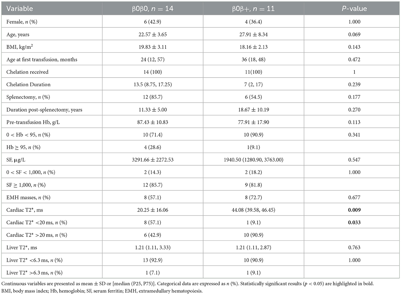 Patients were categorized into the homozygous β0 group (n = 14) and the heterozygous β0β+ group (n = 11) based on each allele's phenotypic expression (β0 or β+). A comparison of clinical and MR characteristics was conducted between the two groups.