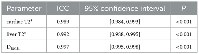 The inter-observer reproducibility for cardiac T2*, liver T2*, and DEMH was excellent (ICC: 0.989-0.997, p < 0.001) (Table 8).