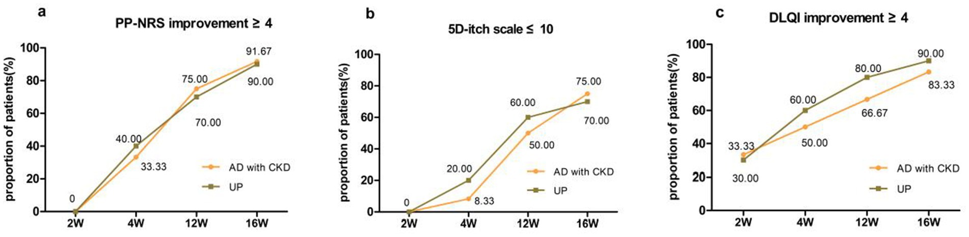 Figure 1. Percentages of AD patients with CKD and UP patients who achieved (a) PP-NRS improvement ≥ 4 points (b) 5D-IS ≤ 10 points, and (c) DLQI improvement ≥ 4 points at week 2, week 4, week 12, and week 16 after dupilumab treatment.