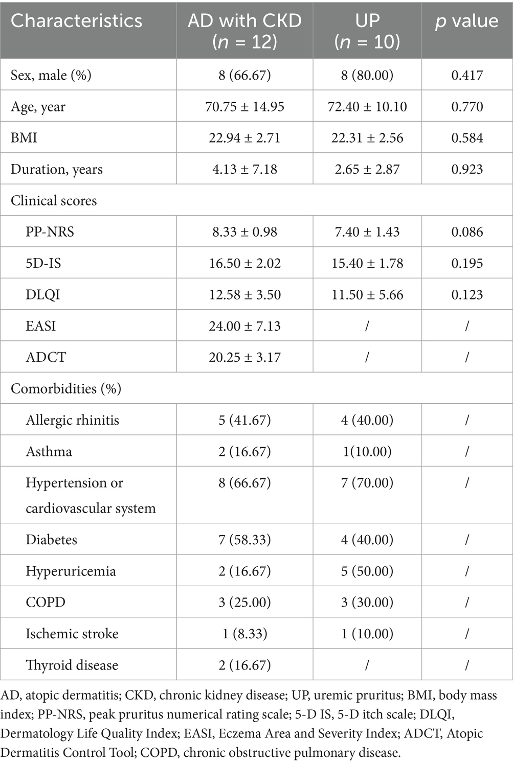 Patients with moderate-to-severe AD and UP who completed 16 weeks of treatment with dupilumab at Sichuan provincial people’s hospital from May 2022 to March 2025 and who also had CKD stages 3–5 were included in the retrospective analysis. The stages of CKD were classified by professional nephrologists. AD was diagnosed based on the Hanifin and Rajka criteria (17). The diagnosis of UP was made by dermatologists and nephrologists based on its definition (18, 19) and the exclusion of possible comorbidities. The specific process for diagnosing UP was as follows: (1) Skin lesion review: no obvious primary lesions in patients suspected of UP, effectively excluding pruritus secondary to dermatological disorders; (2) Comorbidities review: in patients with CKD stages 3–5, pruritus should be attributed to UP in the absence of other well-defined alternative explanations. Patients were divided into an AD group and a UP group according to the two diagnoses. All patients received regular injections of dupilumab (600 mg initial dose, then 300 mg every 2 weeks) (Sanofi, France). The study conformed to the ethical standards outlined in the Declaration of Helsinki. This study was approved by the Ethics Committee of Sichuan provincial people’s hospital (NO. 2022-327), and written informed consent was obtained from the participants.