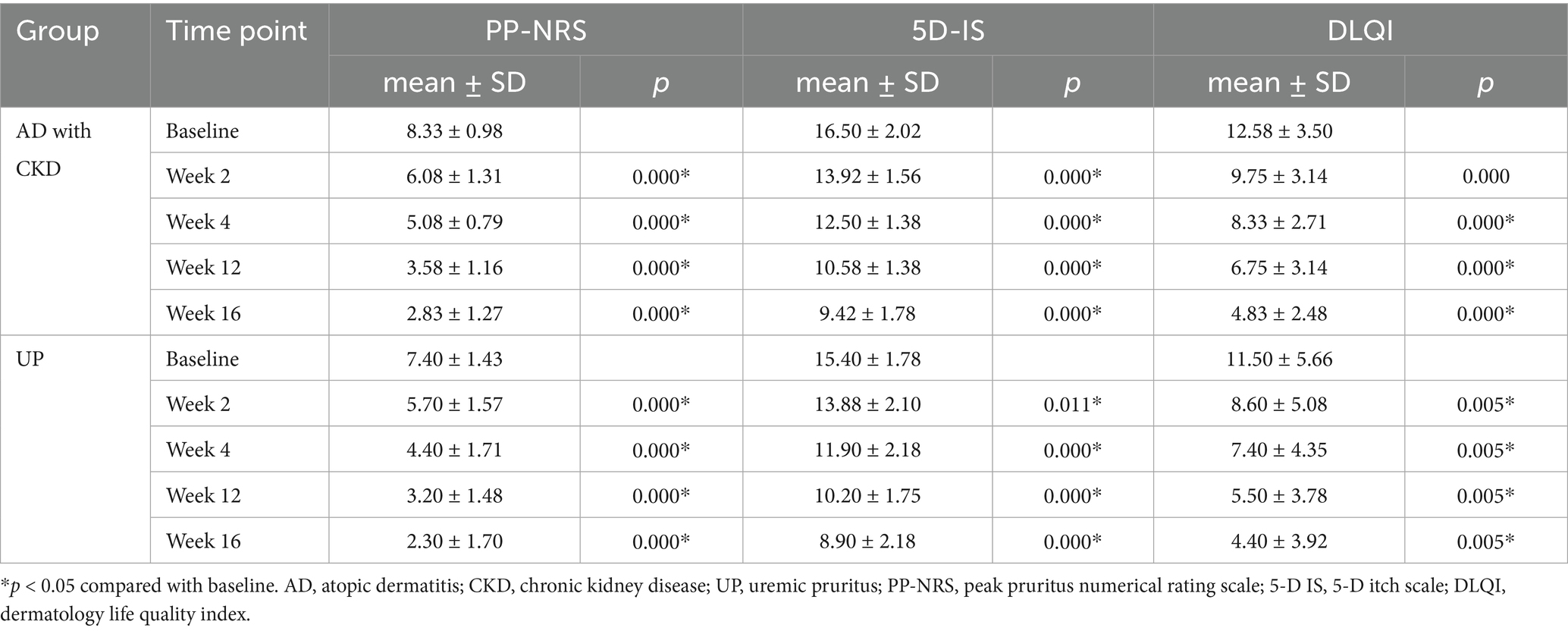 Results: After dupilumab treatment, the PP-NRS and 5D-IS scores of 12 AD patients with CKD and 10 UP patients were significantly decreased. The percentages of UP patients who achieved PP-NRS ≥ 4-point improvement and 5D-IS ≤ 10-point at week 4, 12, and 16 did not significantly differ from those of AD patients with CKD (p > 0.05). At week 16, the skin symptoms in AD patients significantly improved (66.67% achieved EASI-75). No significant adverse effects were found.